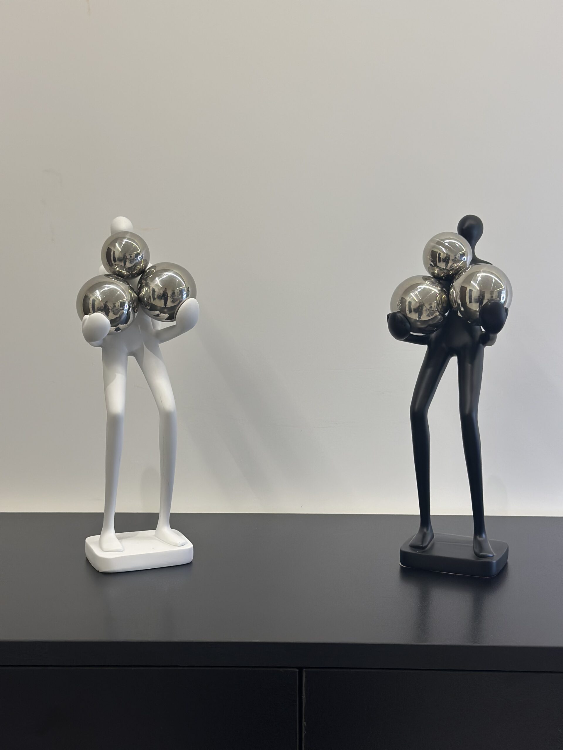 A sleek and artistic resin sculpture of a faceless figure in white & black, carrying three reflective silver spheres. This modern piece blends simplicity with elegance, symbolizing balance, strength, and contemporary design — a perfect statement decor for living rooms, offices, or art-inspired spaces.