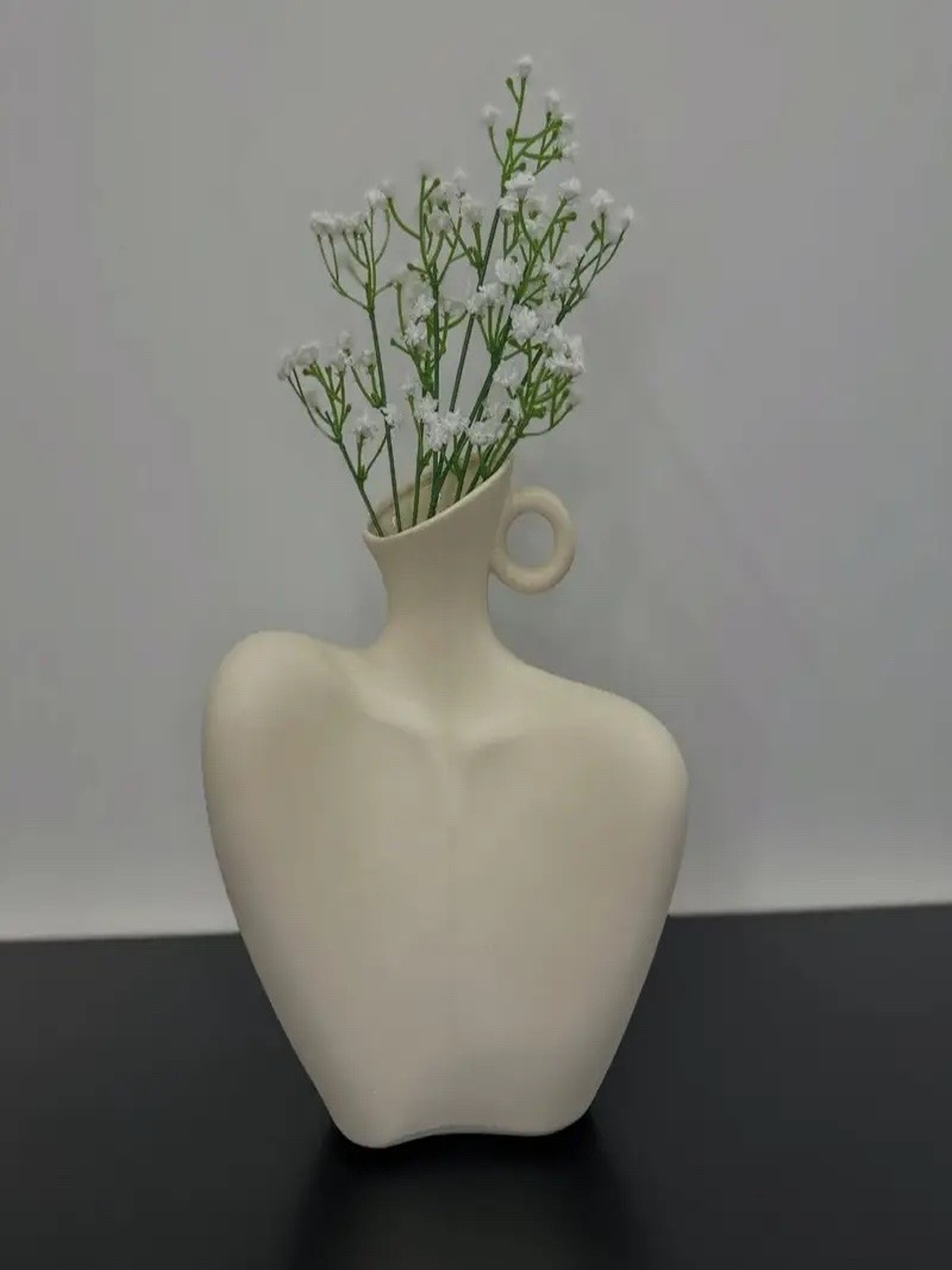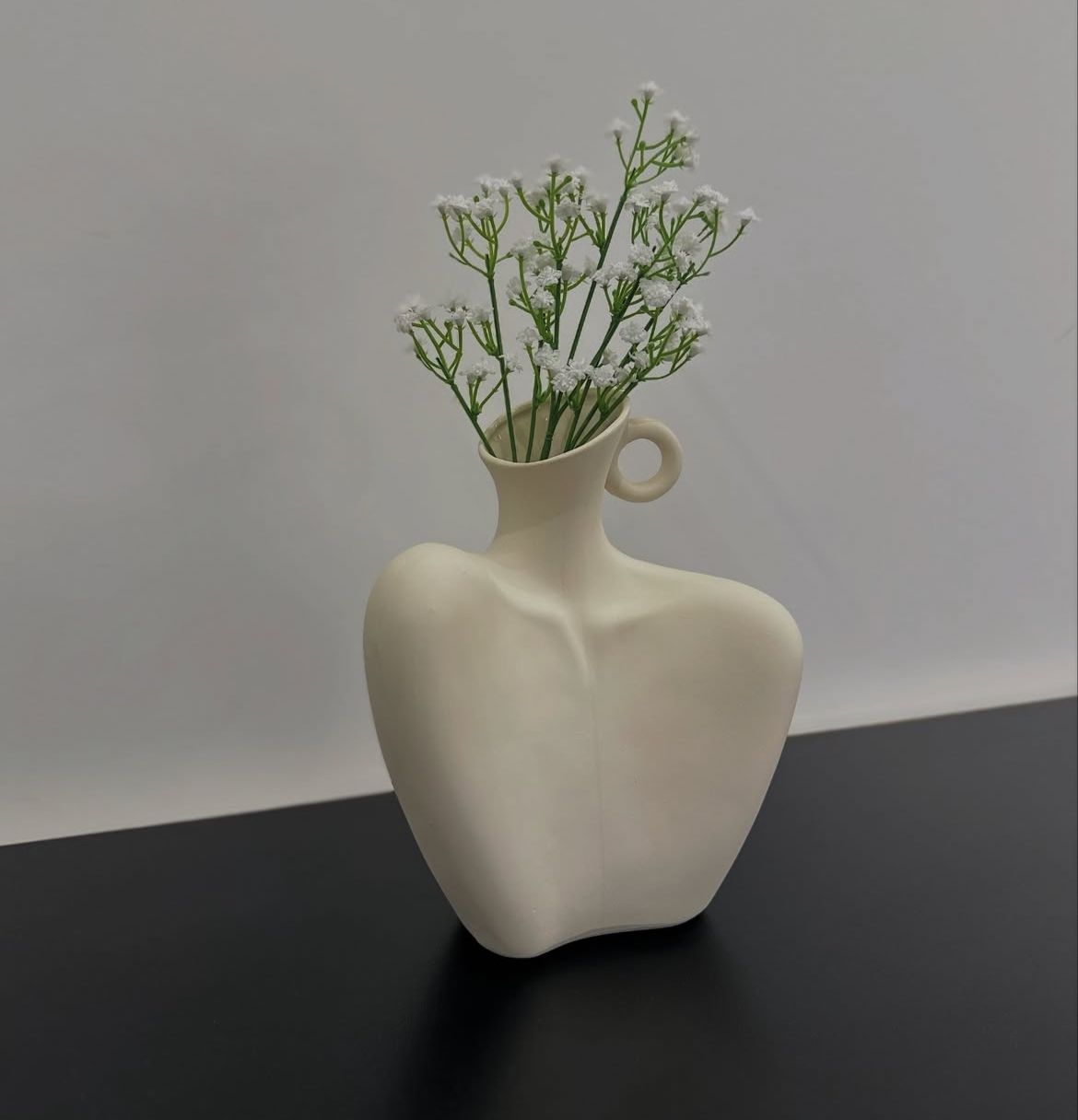 A ceramic vase with a soft matte finish, inspired by the human form and minimalist art. Featuring a graceful curved shape and a circular handle detail, it adds elegance and modern charm to any space—perfect for dried or fresh flowers.