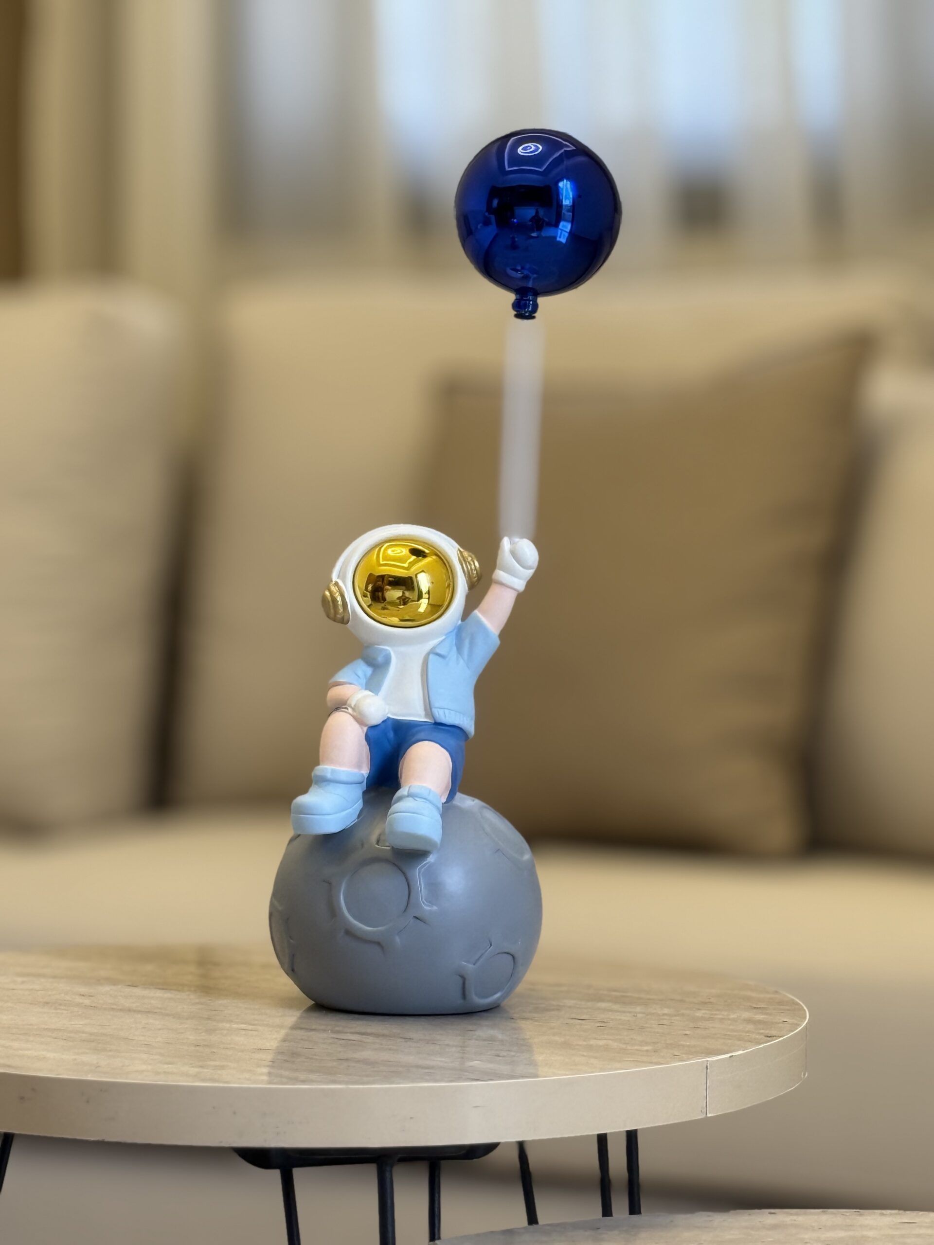 A delightful pair of high-quality resin astronaut figures sitting on moons and holding glossy balloons in pink and blue. With their golden helmets and fine detailing, these sculptures bring a playful and imaginative touch to any decor — perfect for adding a modern, whimsical vibe to your home or office space.
