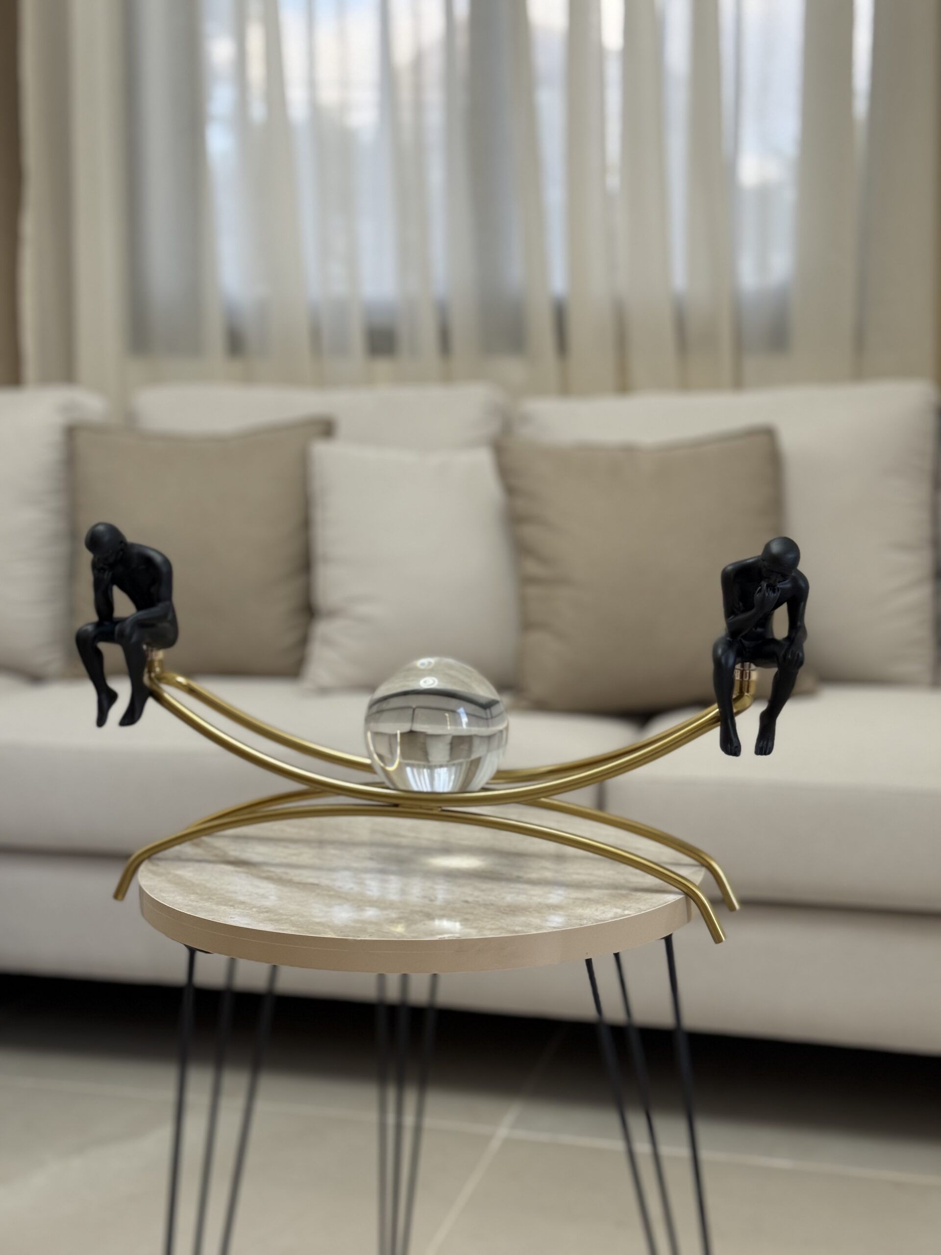 A modern resin sculpture featuring two reflective figures seated on a golden arc with a crystal sphere at the center. This unique design symbolizes harmony and contemplation, making it a sophisticated statement piece for contemporary home decor.