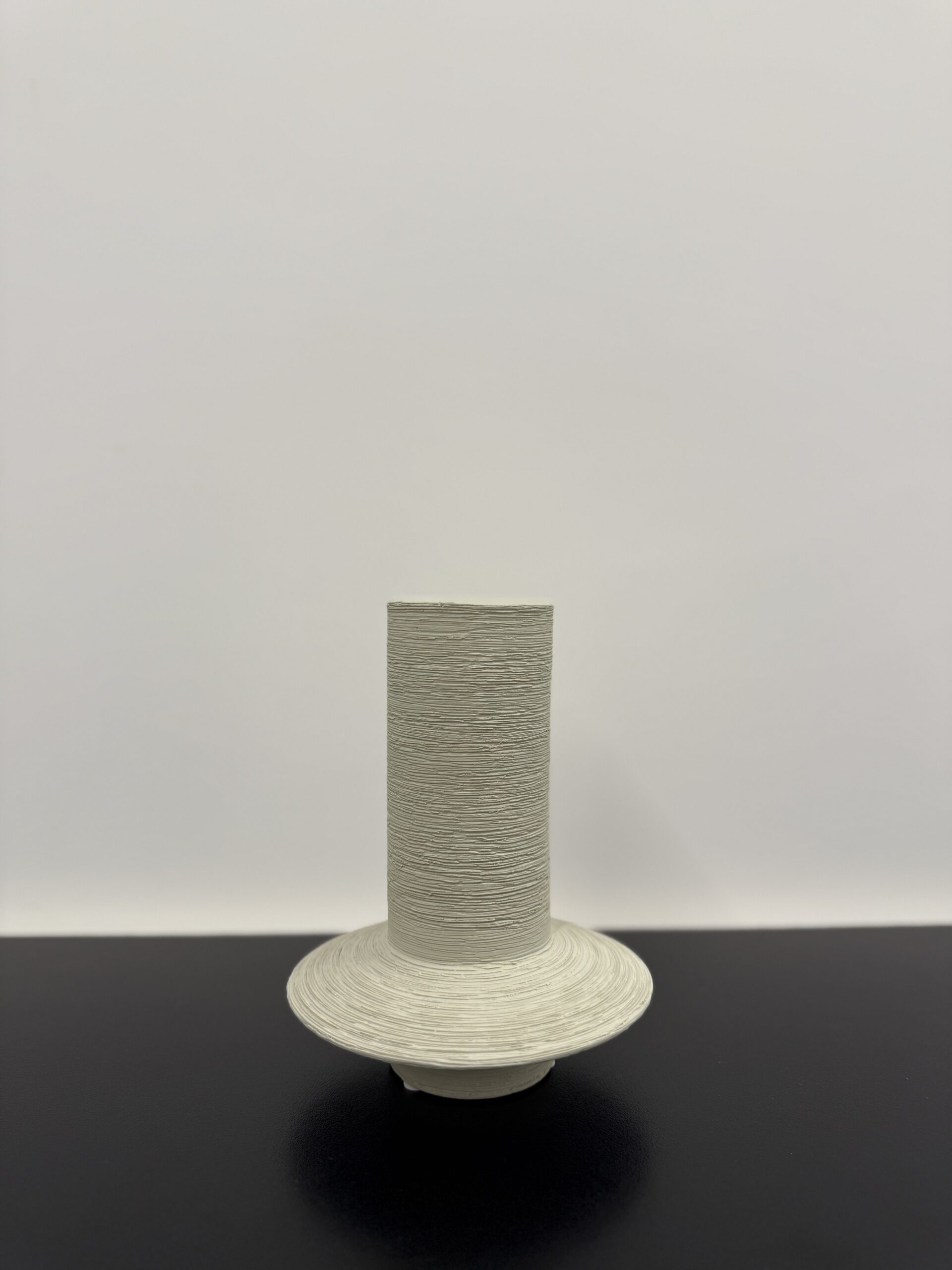 A sleek, cylindrical vase featuring a distinctive raised plate-like ring near its base. This subtle design element adds texture and visual interest to the otherwise smooth, minimalistic form, making it a modern and elegant piece for any interior setting.