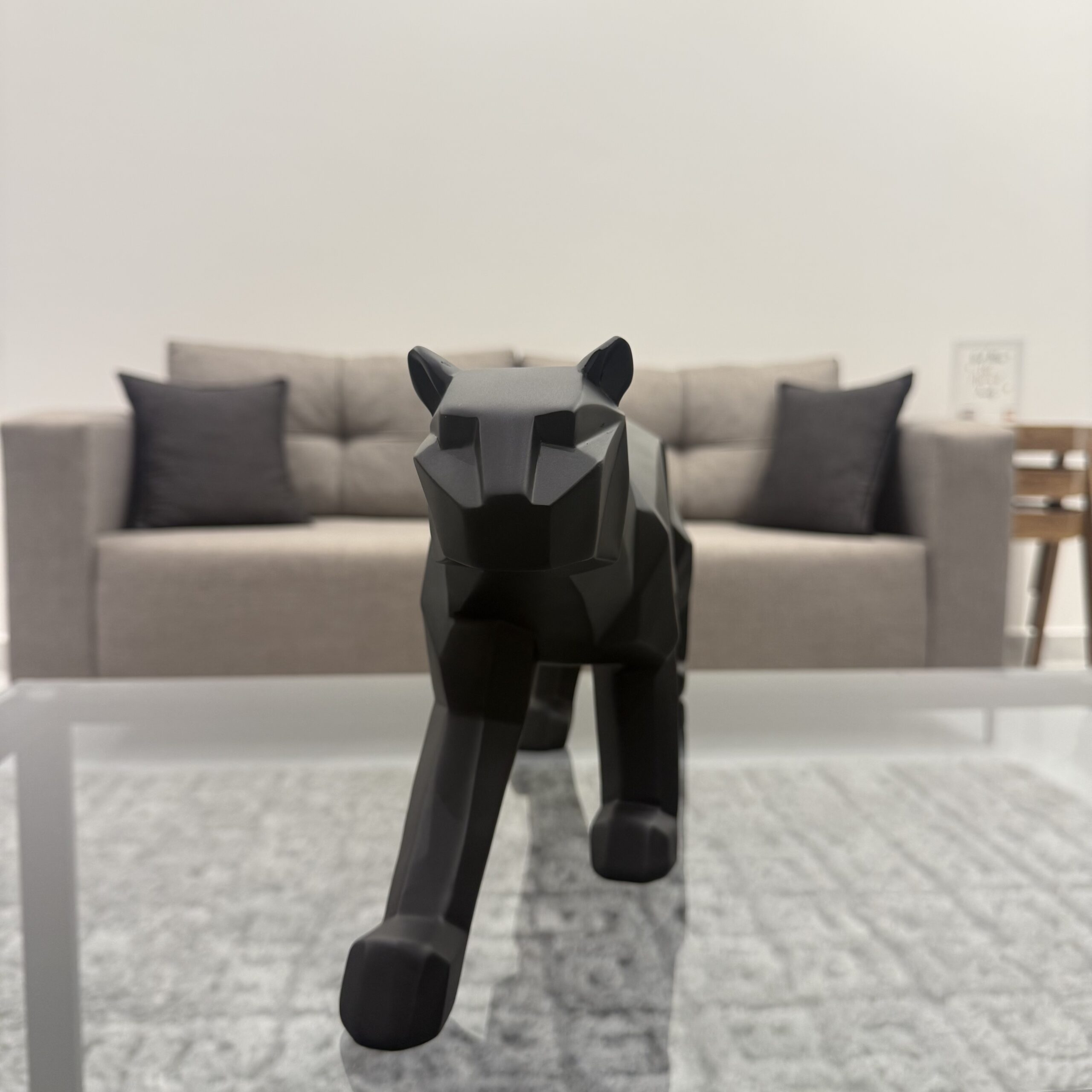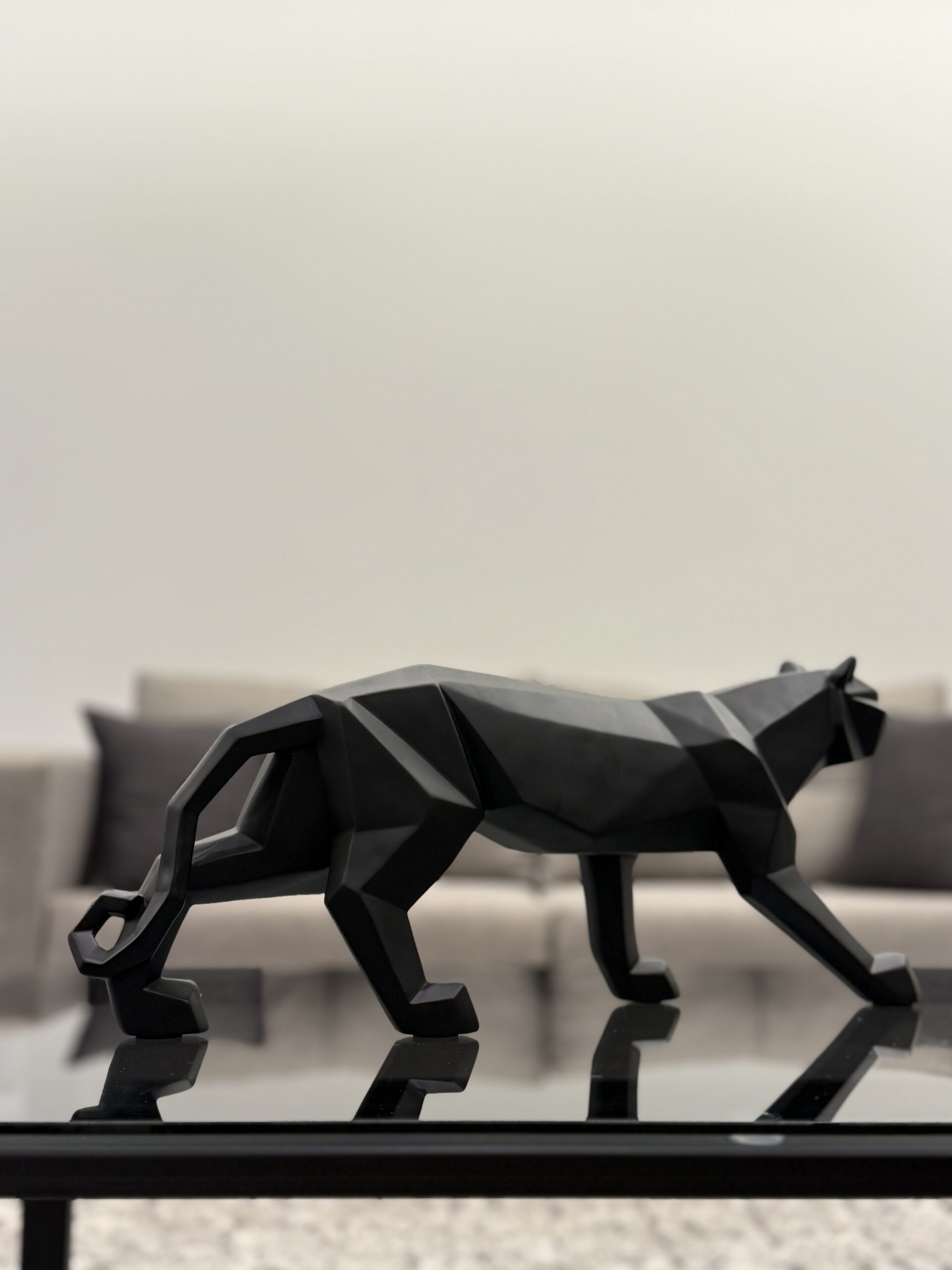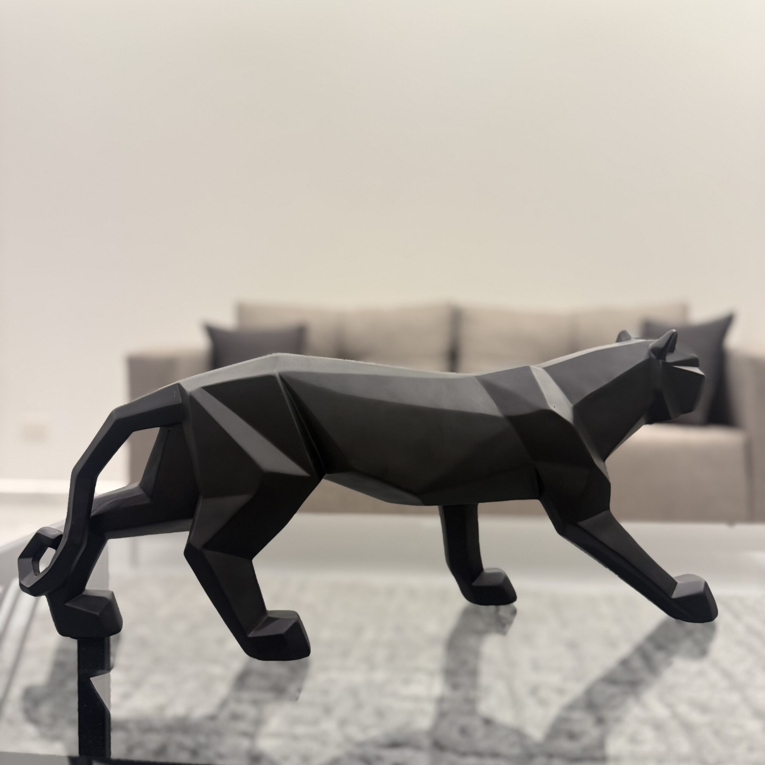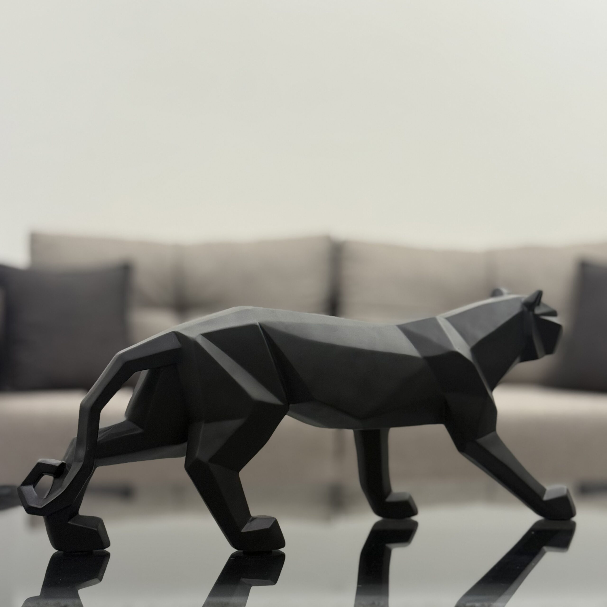 A sleek, geometric panther sculpture crafted from high-quality resin, finished in a deep matte black. Its bold lines and modern form create a powerful statement piece, perfect for contemporary interiors and luxury decor settings.