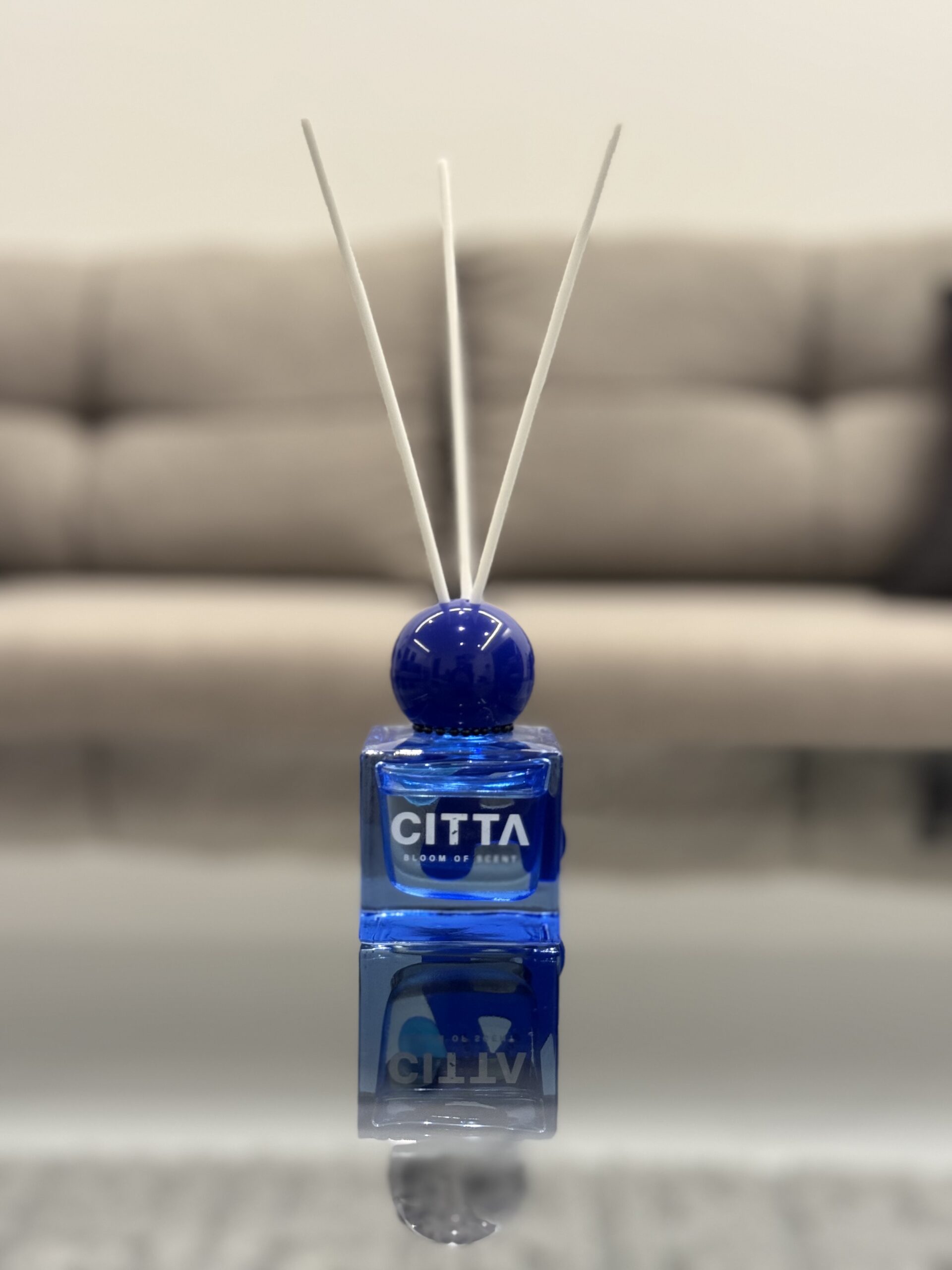 A stylish reed diffuser in an elegant blue glass bottle, designed to fill your space with a long-lasting fresh fragrance and add a modern decorative touch.