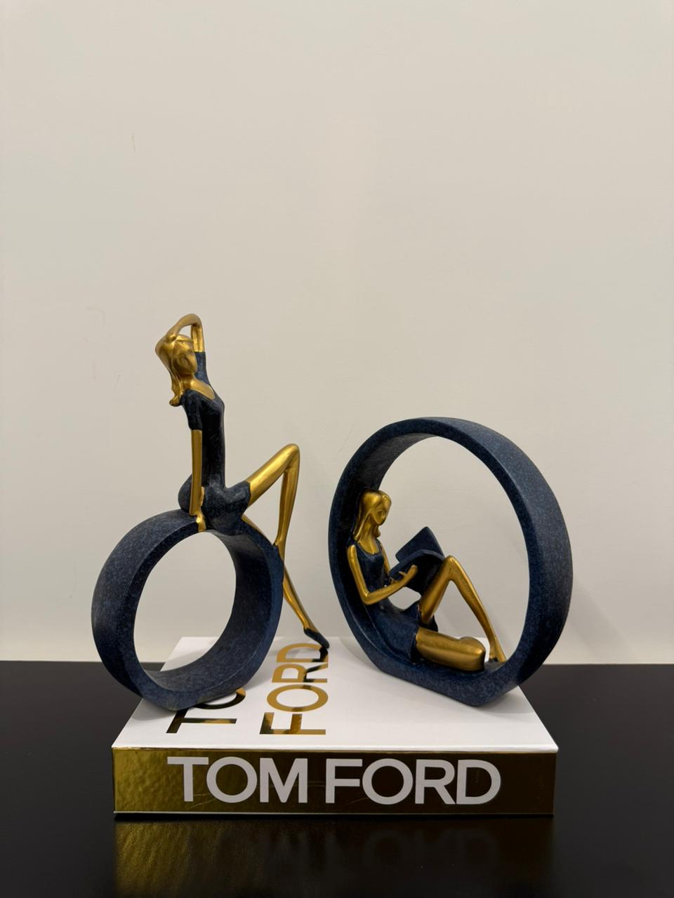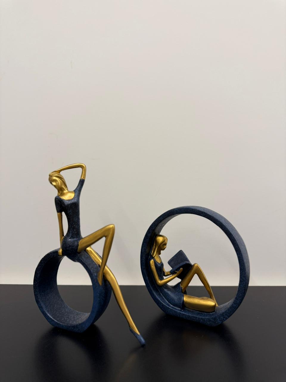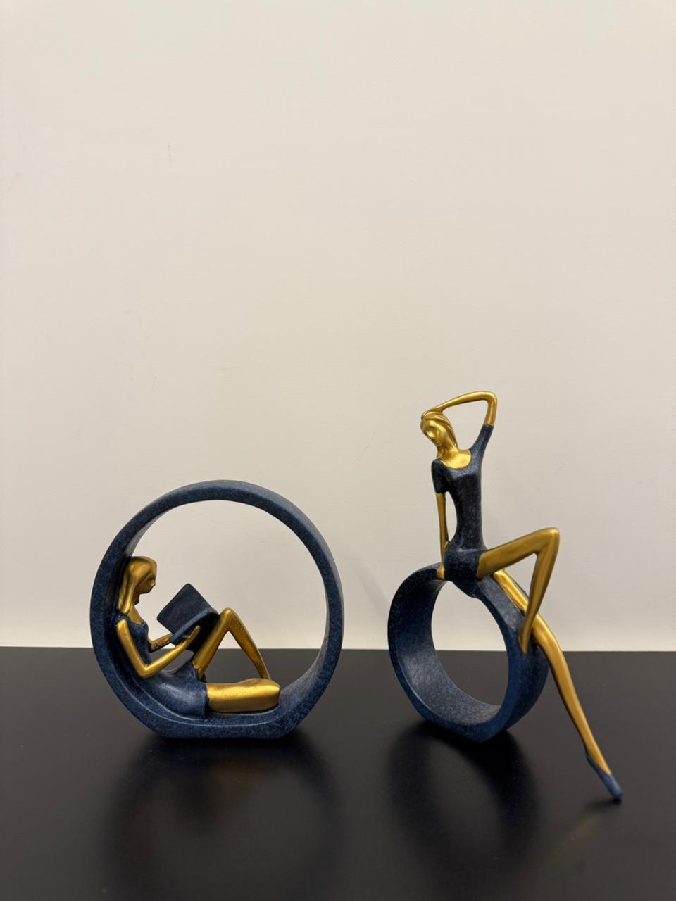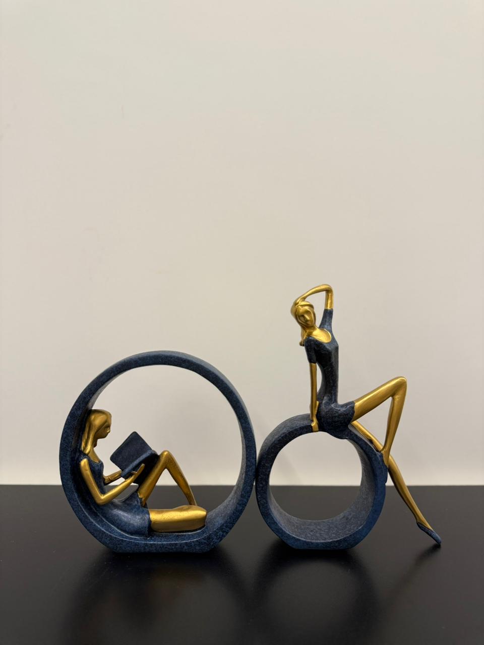 A graceful set of resin ornaments featuring two women in quiet, reflective poses. One rests inside a standing circle, leaning back with a book in hand; the other sits elegantly on the outer edge, gently brushing her hair. Finished in soft, neutral tones, these pieces bring a sense of calm and balance to any shelf or tabletop display.