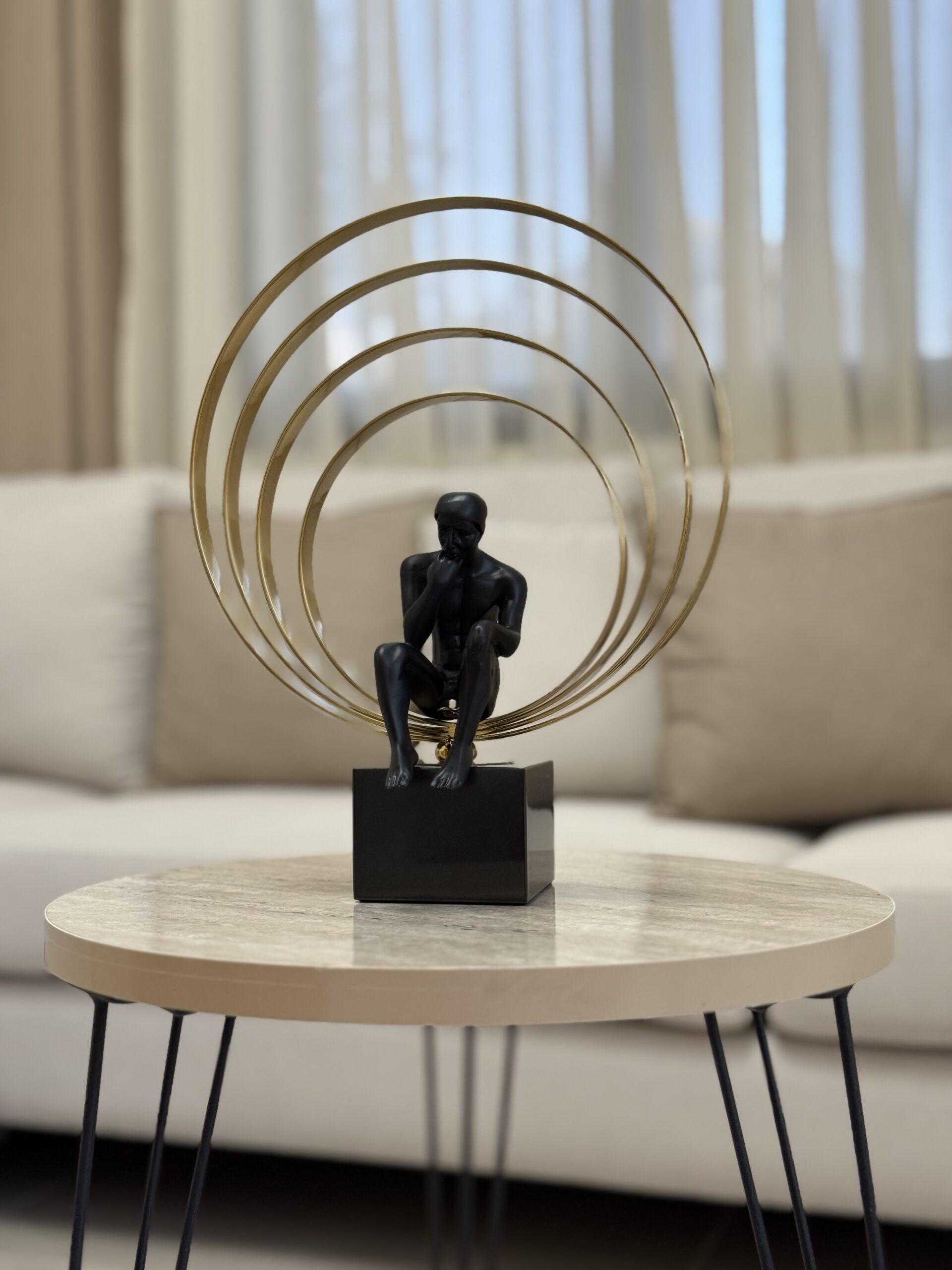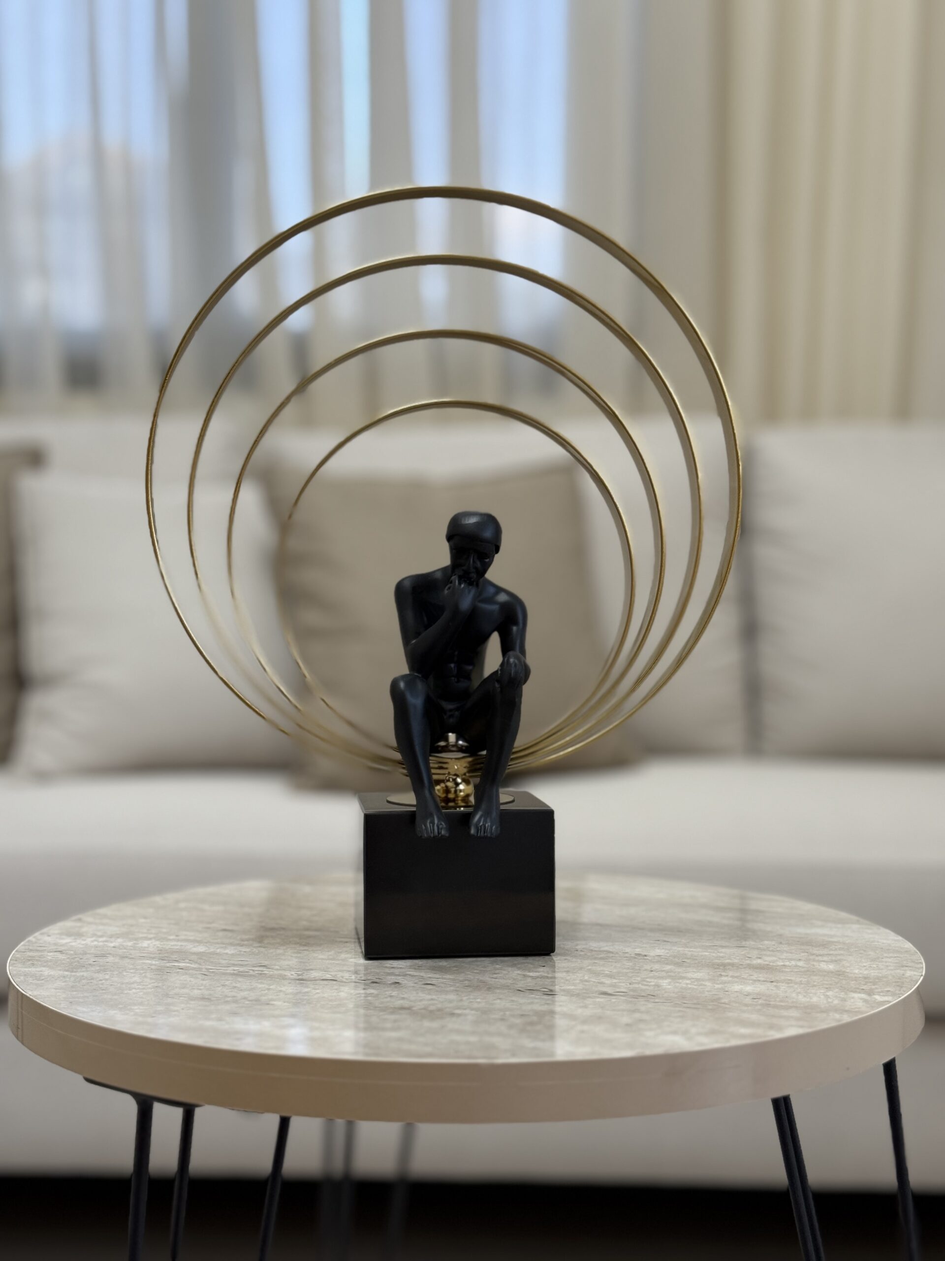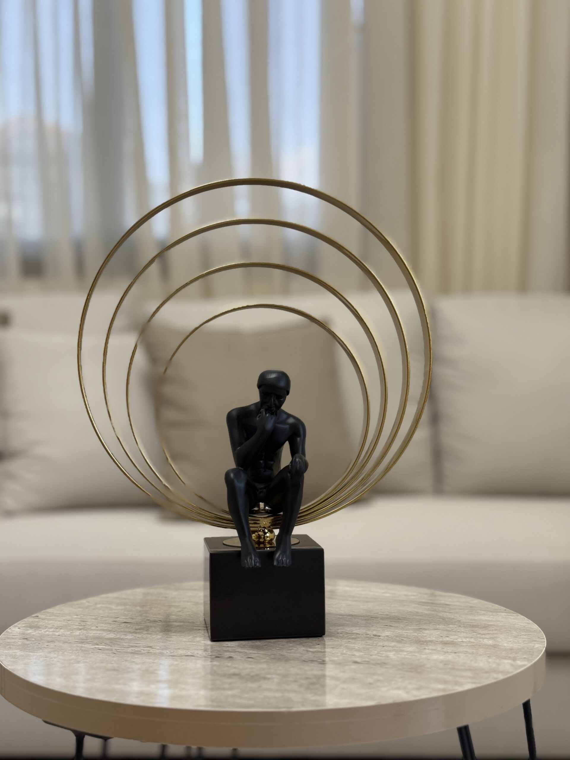 A high-quality modern sculpture featuring a resin man seated in deep thought, set on a solid black marble base with elegant golden steel rings. A striking blend of art and luxury, perfect for elevating any contemporary space.