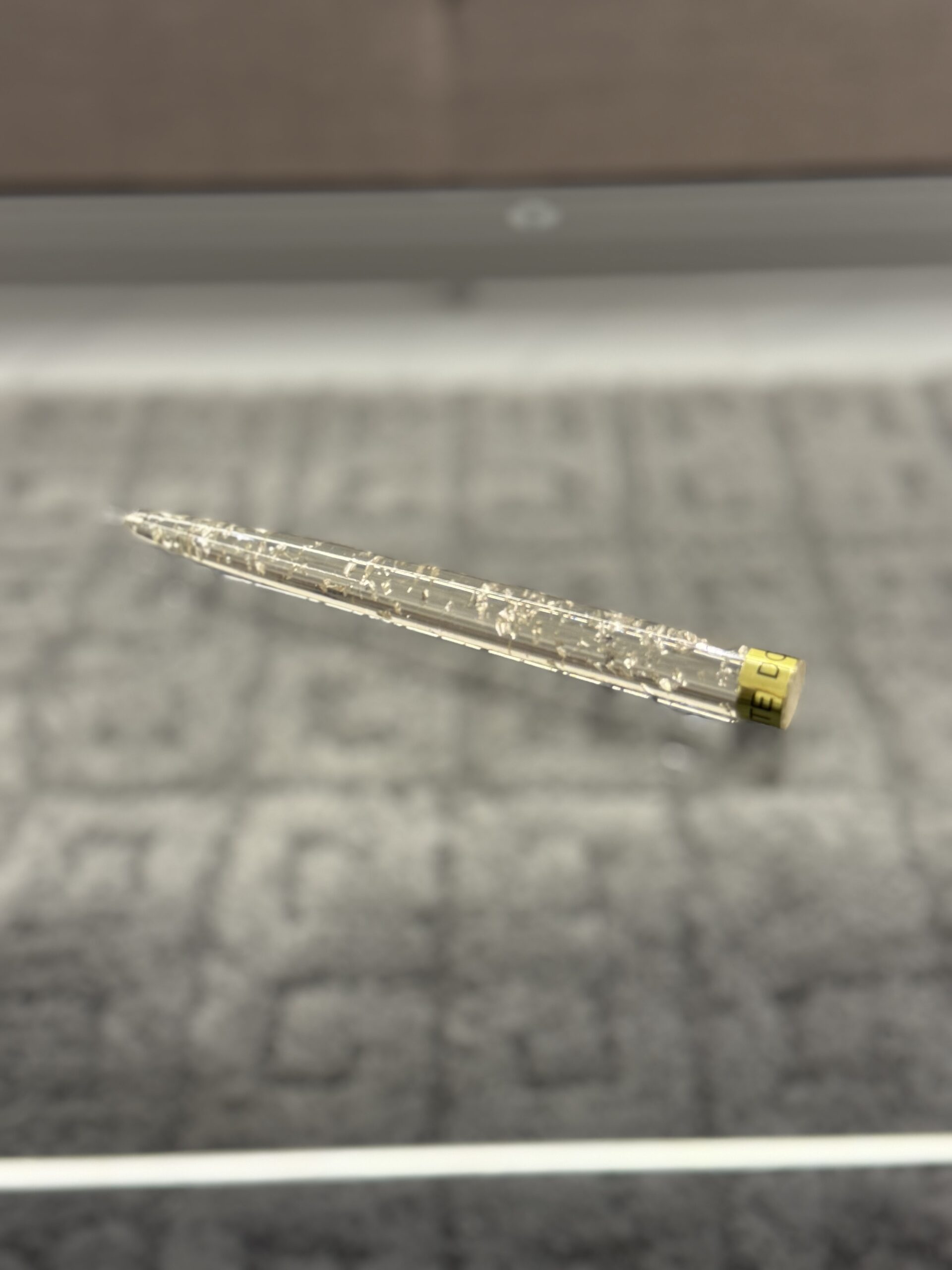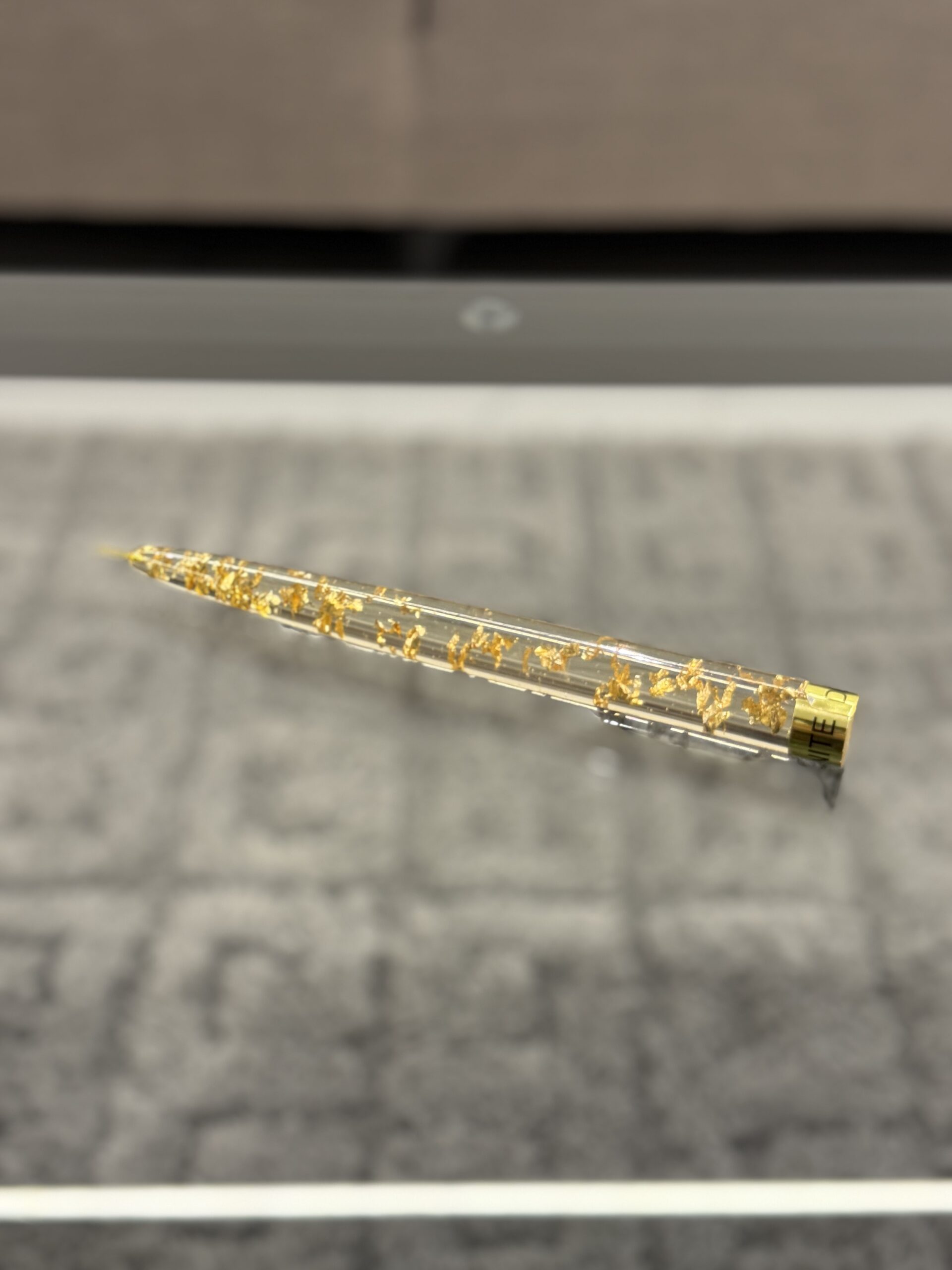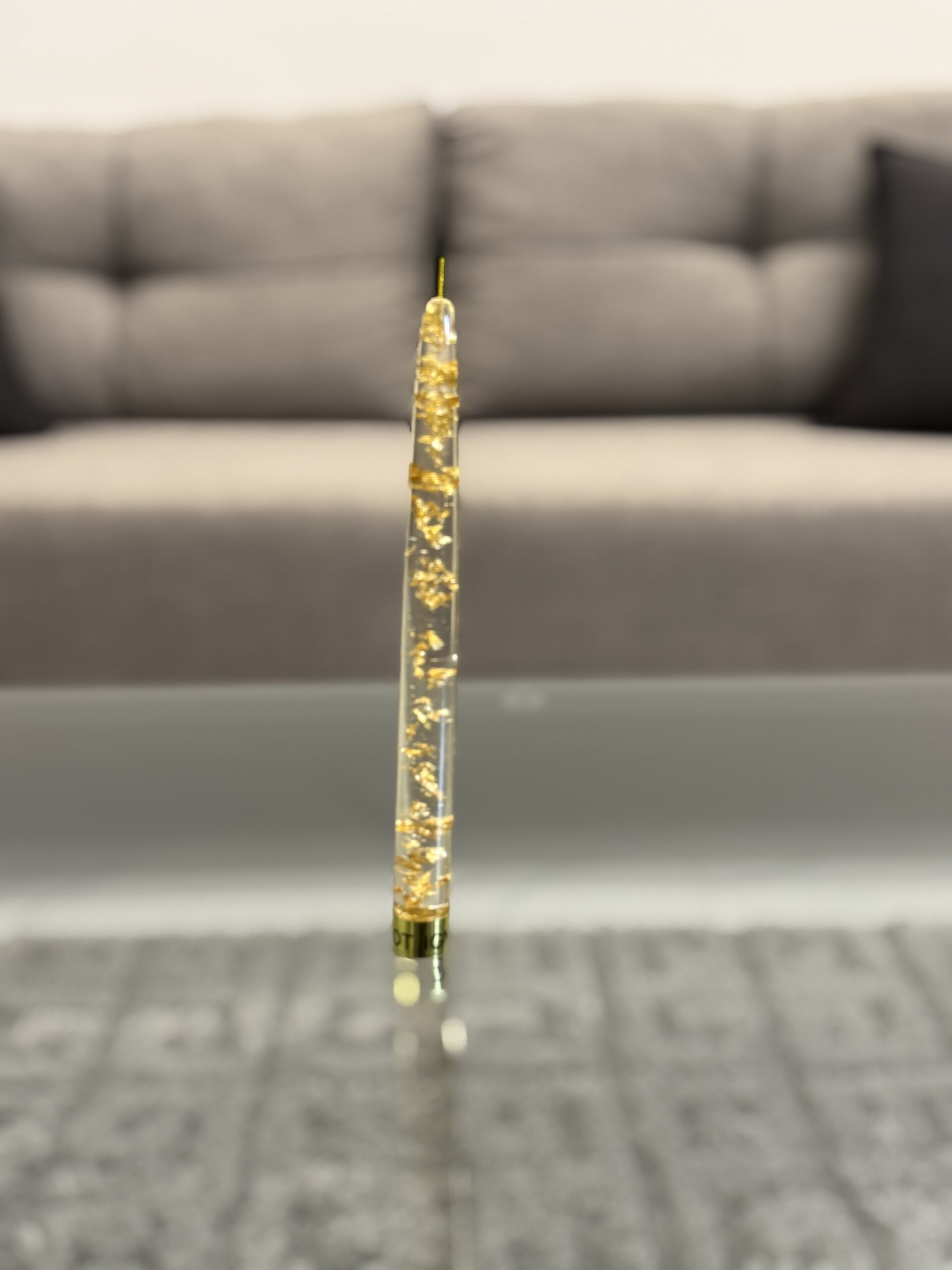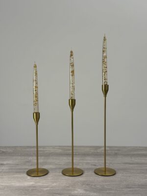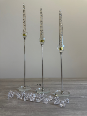 Elegant clear taper candles with shimmering flakes, available in gold and silver, perfect for adding a luxury touch to any table setting or home décor.