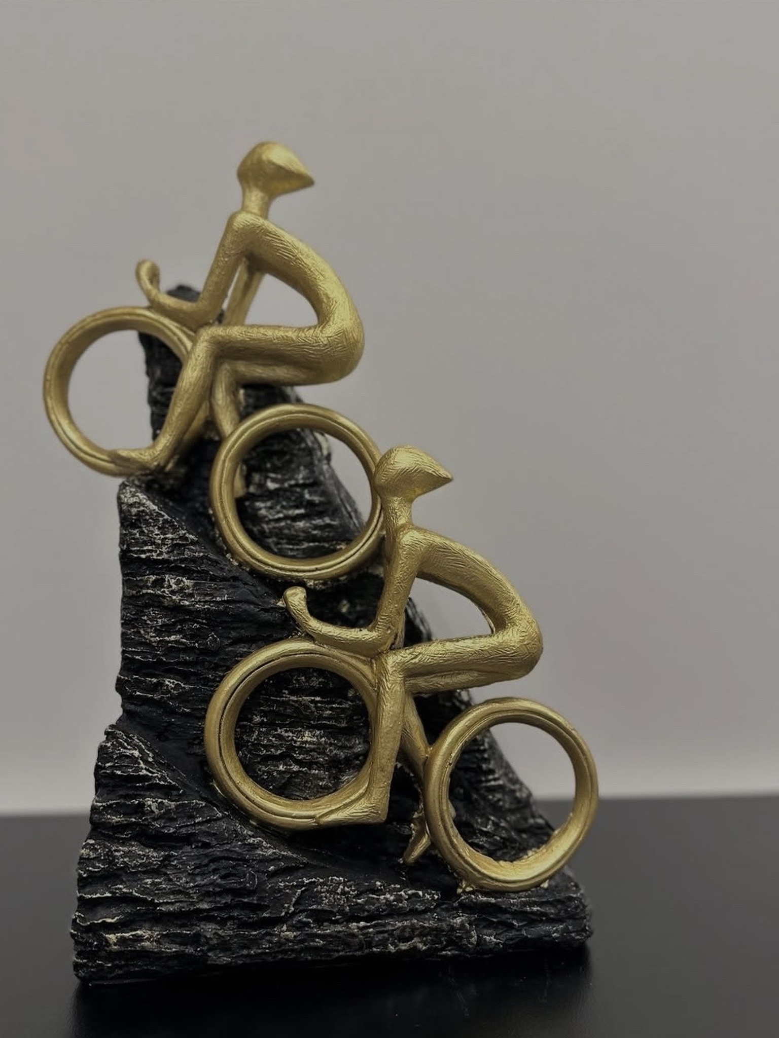 A powerful resin sculpture depicting two golden cyclists ascending a black mountain peak. Symbolizing determination and teamwork, this dynamic piece adds bold energy and inspiration to any space. Perfect for modern décor with a sporty edge.