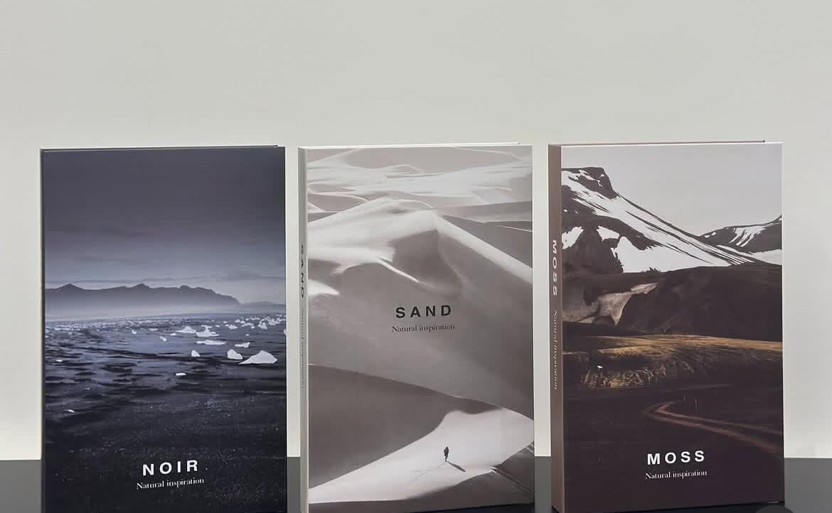 A curated set of decorative books that capture the raw beauty of nature through minimalist design and powerful landscapes. Each cover reflects a unique natural element — icy black shores, soft desert dunes, and mossy mountain terrain — blending earthy tones with modern elegance.