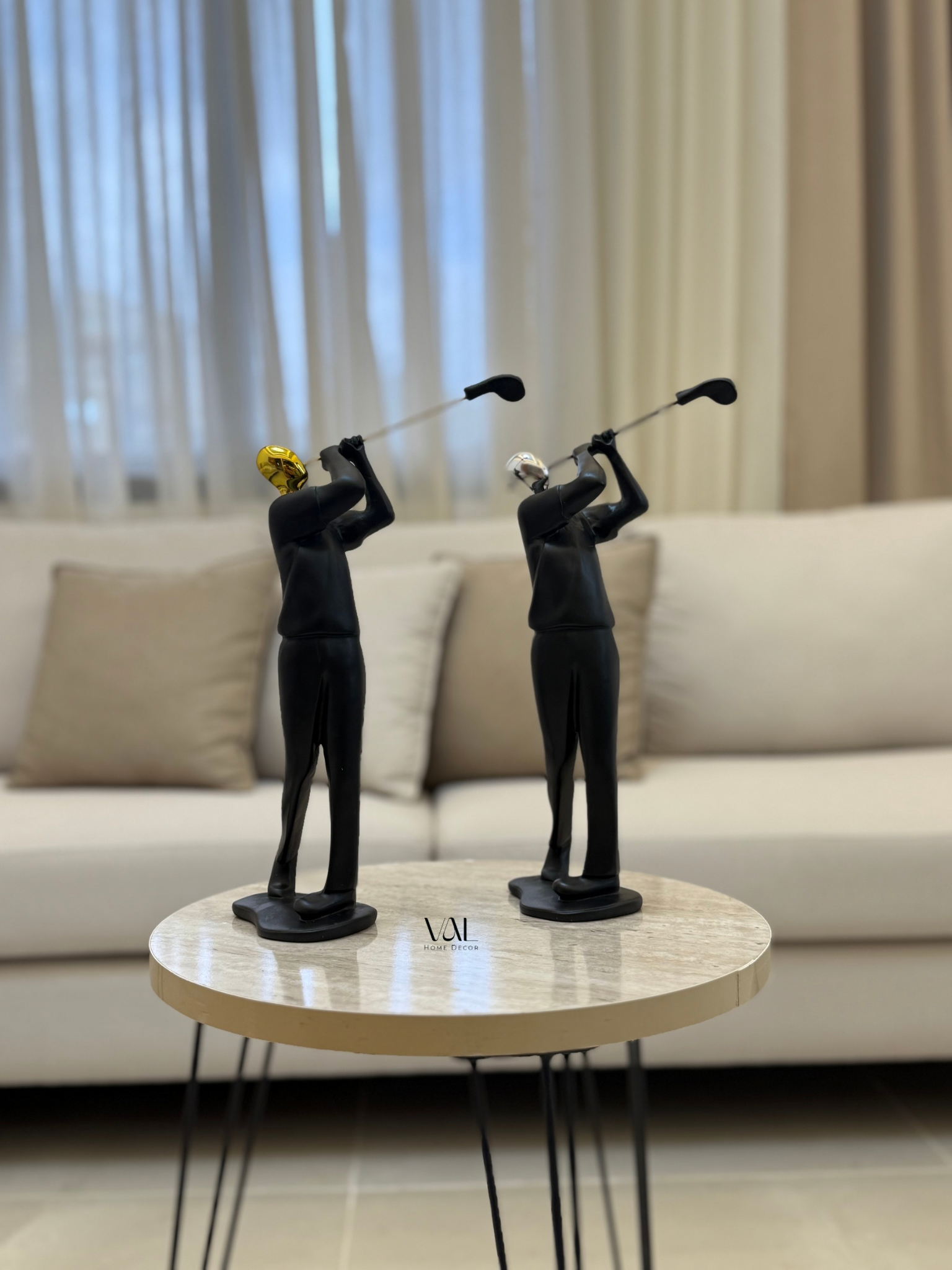 Stylish resin golfer statues featuring sleek black bodies with striking gold and silver heads. These elegant pieces capture the perfect swing — a symbol of precision, focus, and modern sophistication. Perfect for elevating your home or office decor.