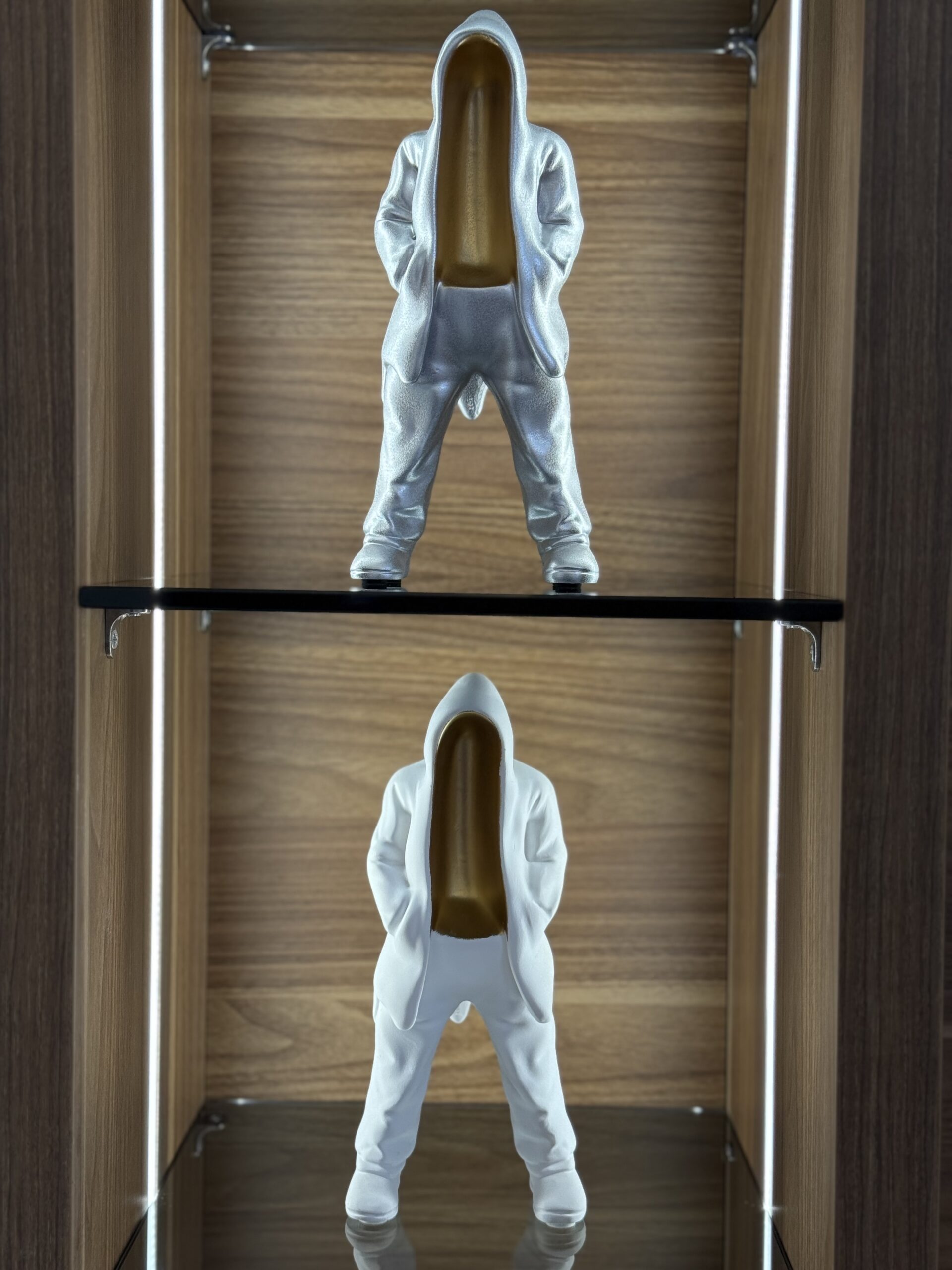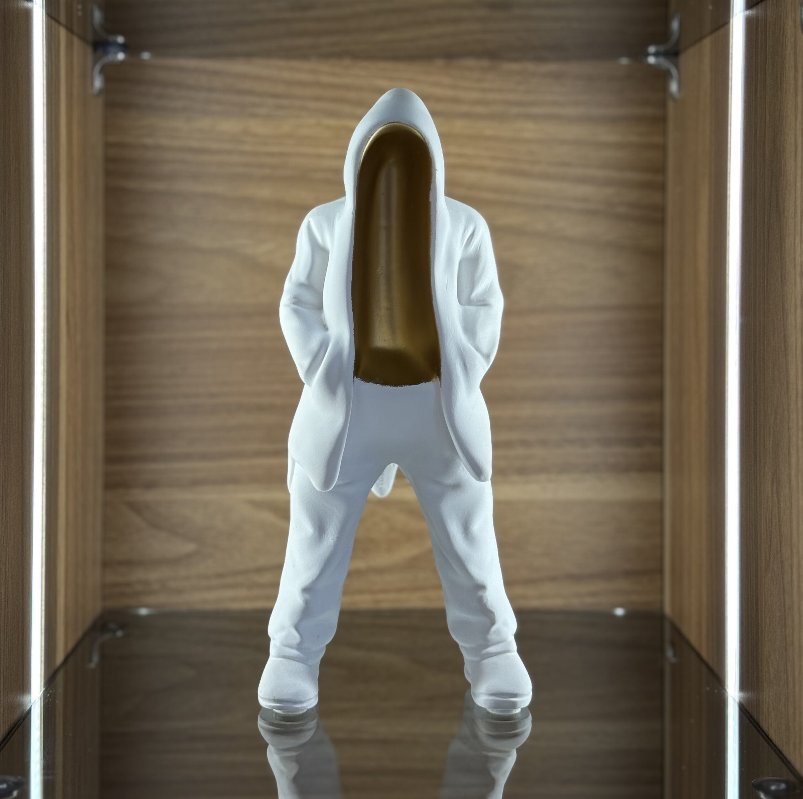 A modern and minimalist resin sculpture featuring a faceless figure in a white hoodie with hands in pockets. Its sleek design and faceless style symbolize anonymity, mystery, and contemporary urban culture, making it a bold decorative piece for living rooms, offices, or art displays.