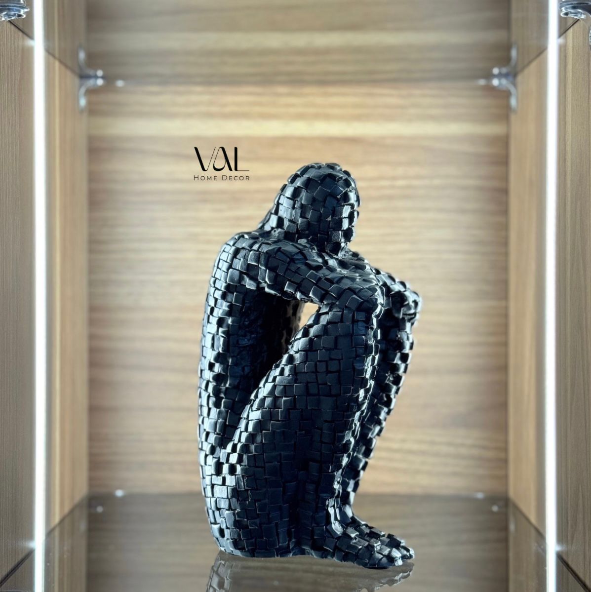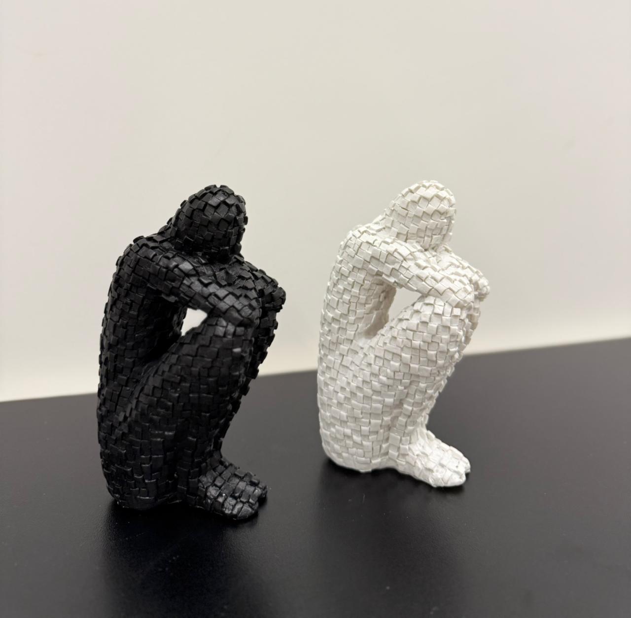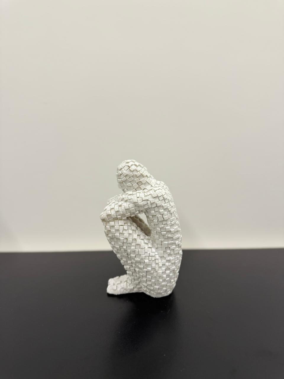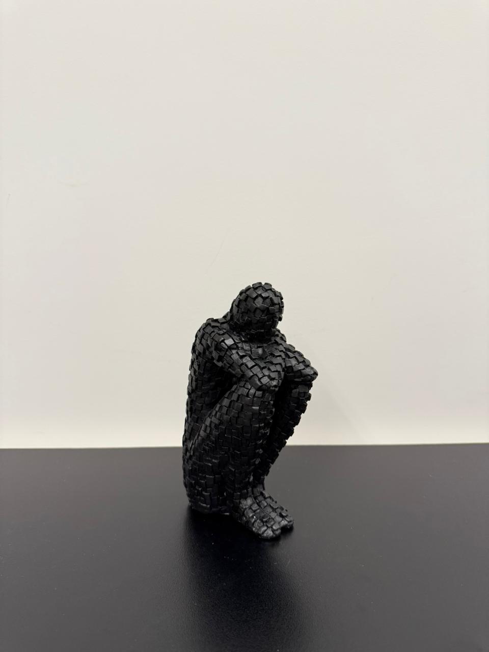 A resin sculpture depicting a man seated in introspective embrace, his form composed of intricate geometric tessellations. The textured surface adds depth and emotion, making it a powerful statement piece for contemporary spaces.