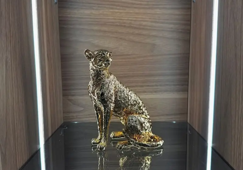 A stunning golden cheetah resin sculpture, beautifully crafted to capture grace and power in perfect harmony. With a sleek, glossy finish and poised posture, this piece adds a bold yet elegant touch to any modern space. Ideal for shelves, consoles, or display cabinets.