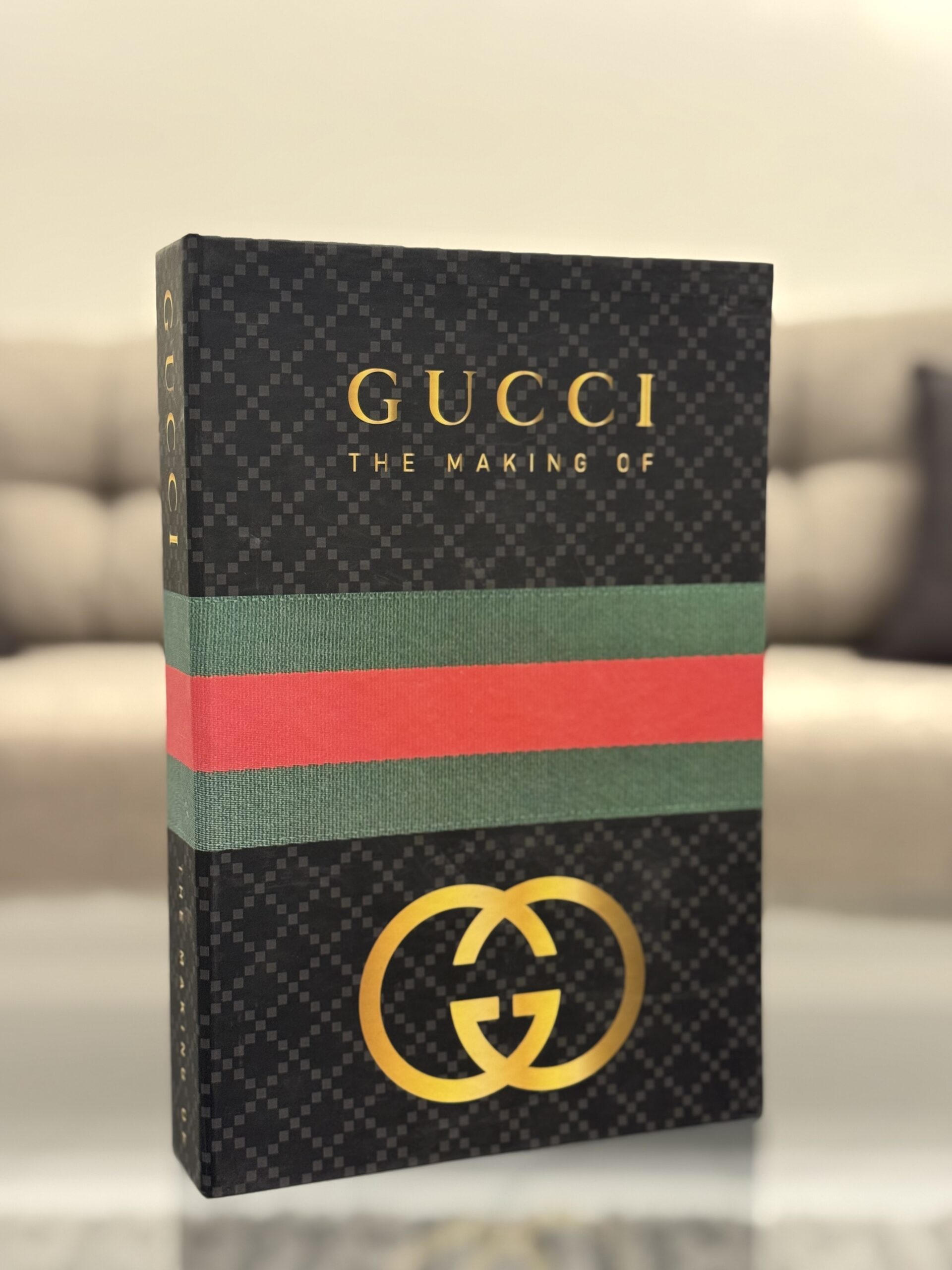 A stylish Gucci-inspired decorative book box featuring the iconic stripe design, perfect for luxury home décor and discreet storage.