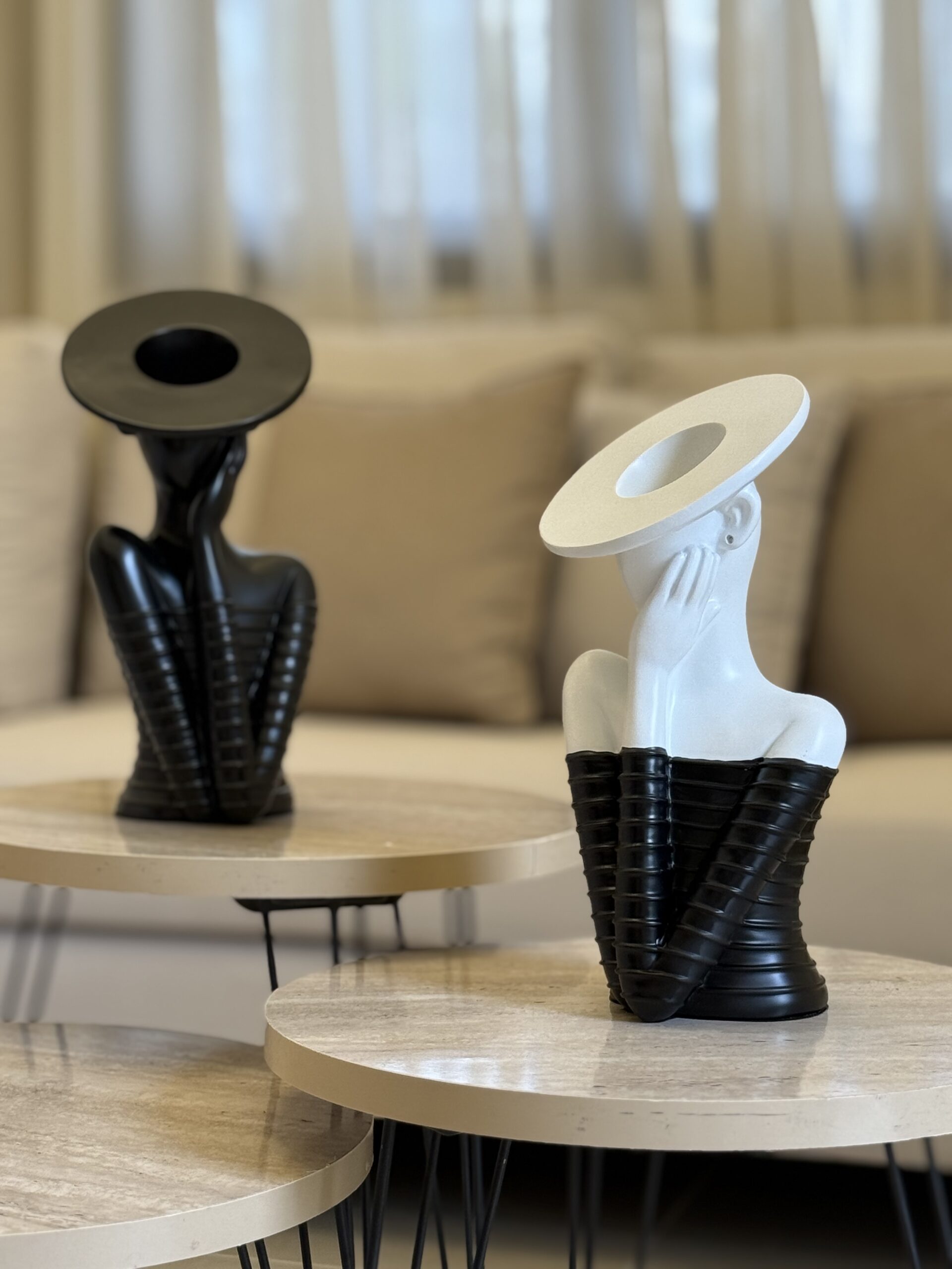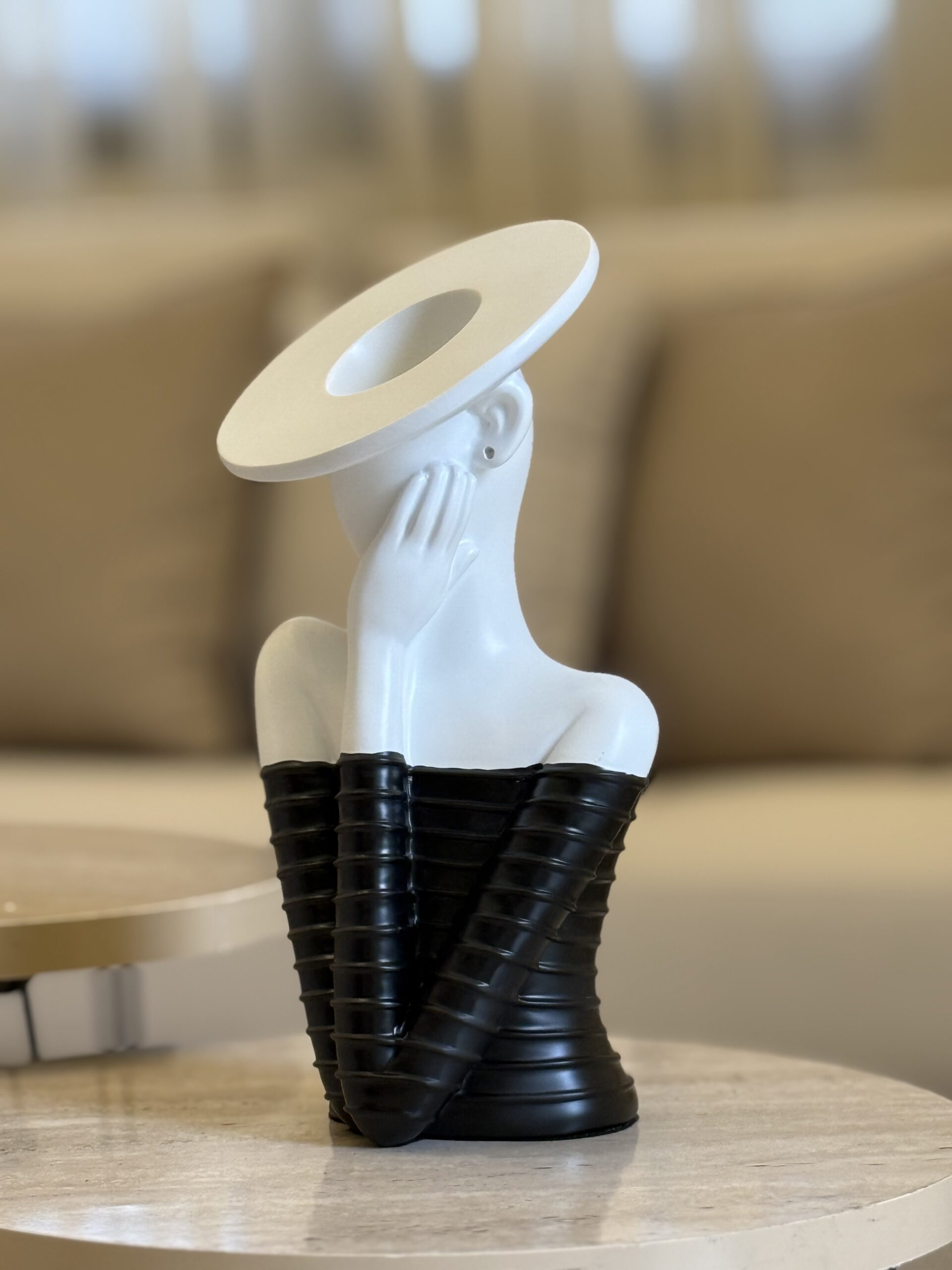 The Halo Elegance Sculpture is a striking modern art piece available in black and white. Crafted from high-quality resin, it features a graceful female figure with a bold circular halo design, symbolizing beauty and sophistication. Perfect for adding a touch of contemporary art and refined style to your living room, office, or gallery space.
