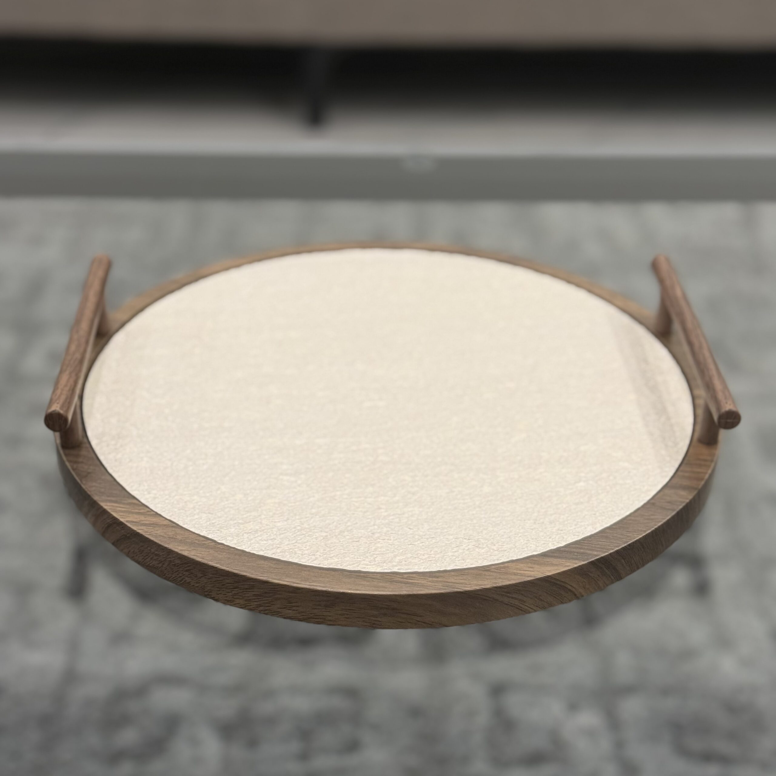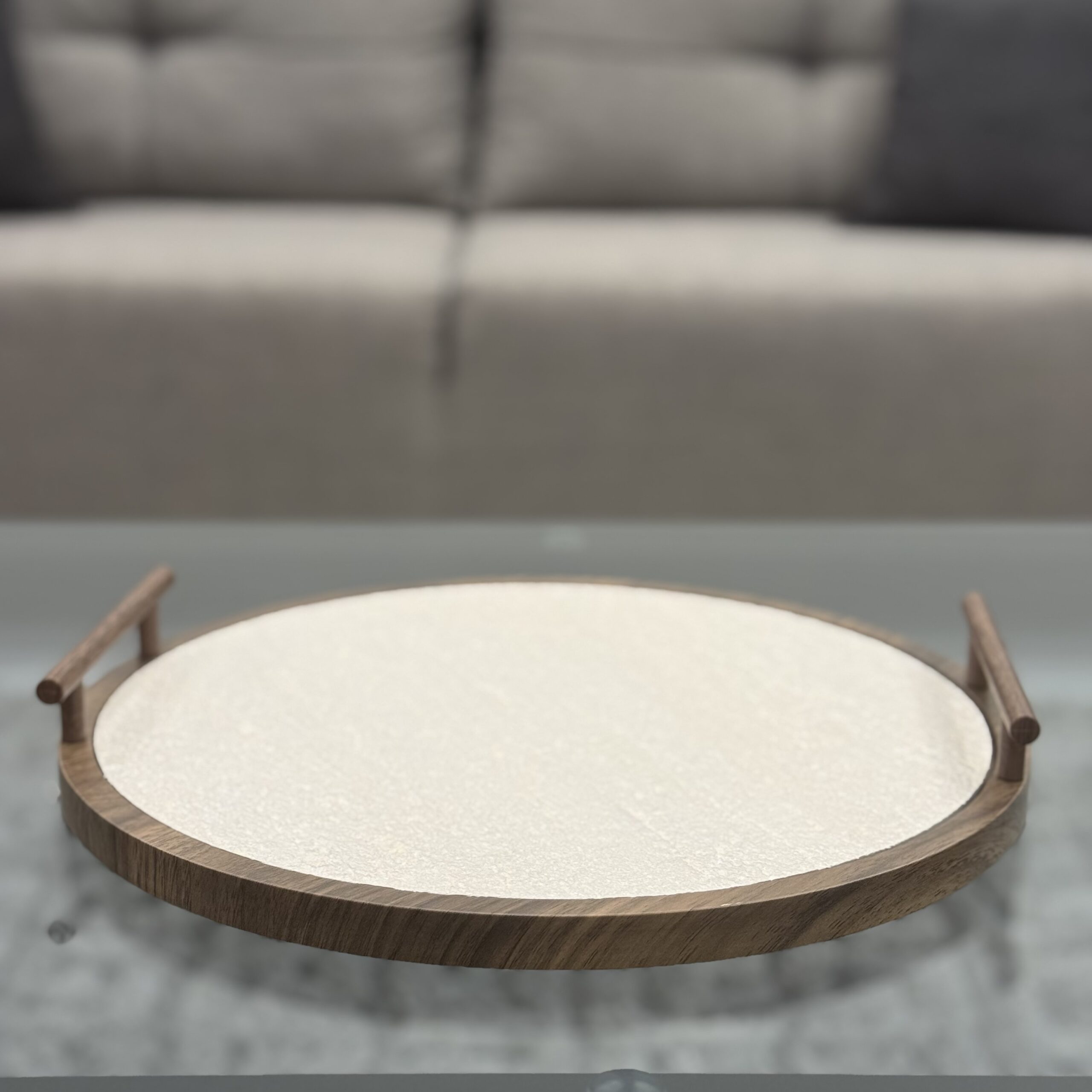 An elegant round tray set crafted with a warm wood frame and smooth minimalist surface, designed for stylish serving and modern tabletop display.