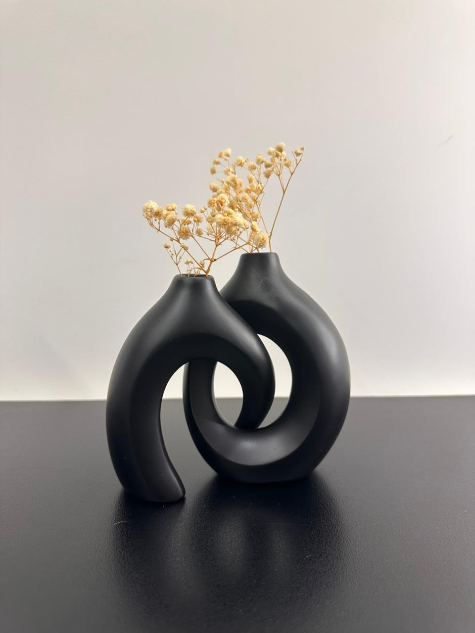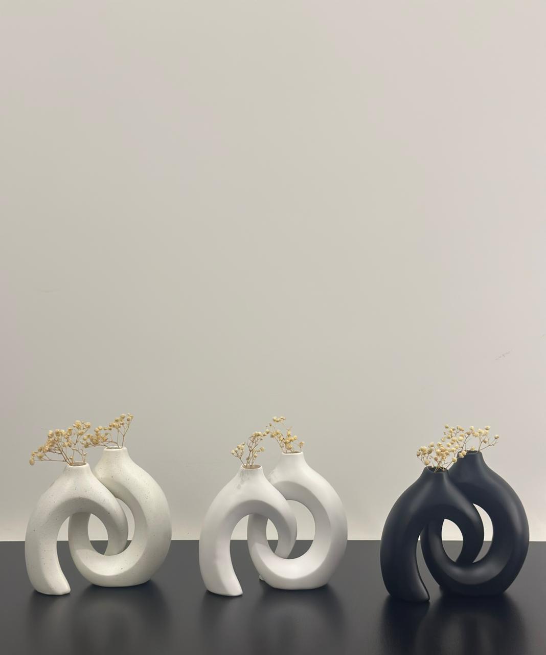 This elegant resin vase set features a contemporary, abstract design with a smooth matte white finish. The interconnected curved forms create a harmonious and sculptural aesthetic, perfect for minimalistic or modern interiors. Ideal as a centerpiece or decorative accent, this set combines functionality with artistic expression.