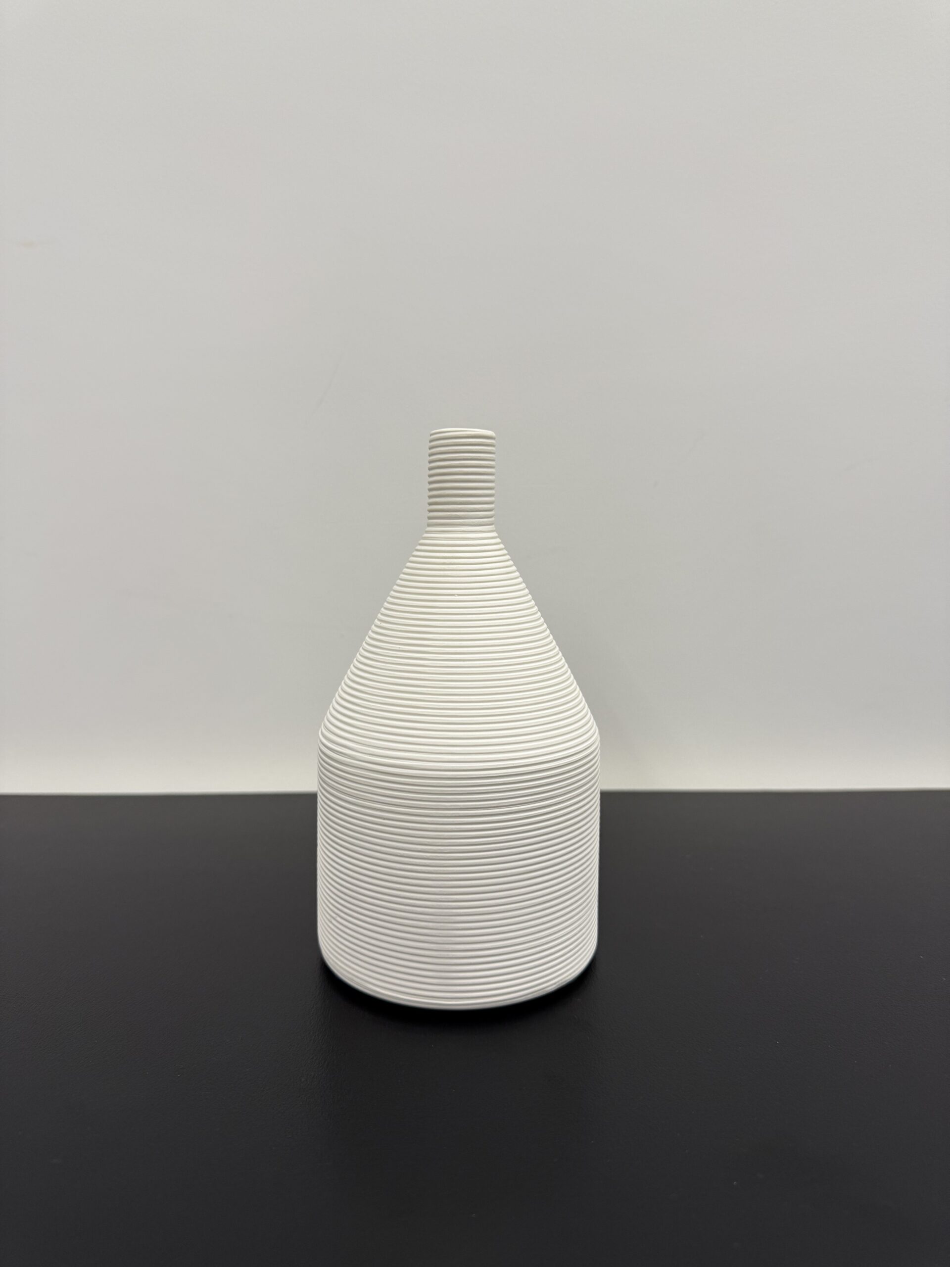 This stylish ceramic vase features a bottle-like silhouette with a narrow neck and wide base, finished in a clean white tone with fine horizontal stripes for texture. Its modern, minimalist design makes it a perfect accent for shelves, side tables, or as a vessel for dried or single-stem florals.