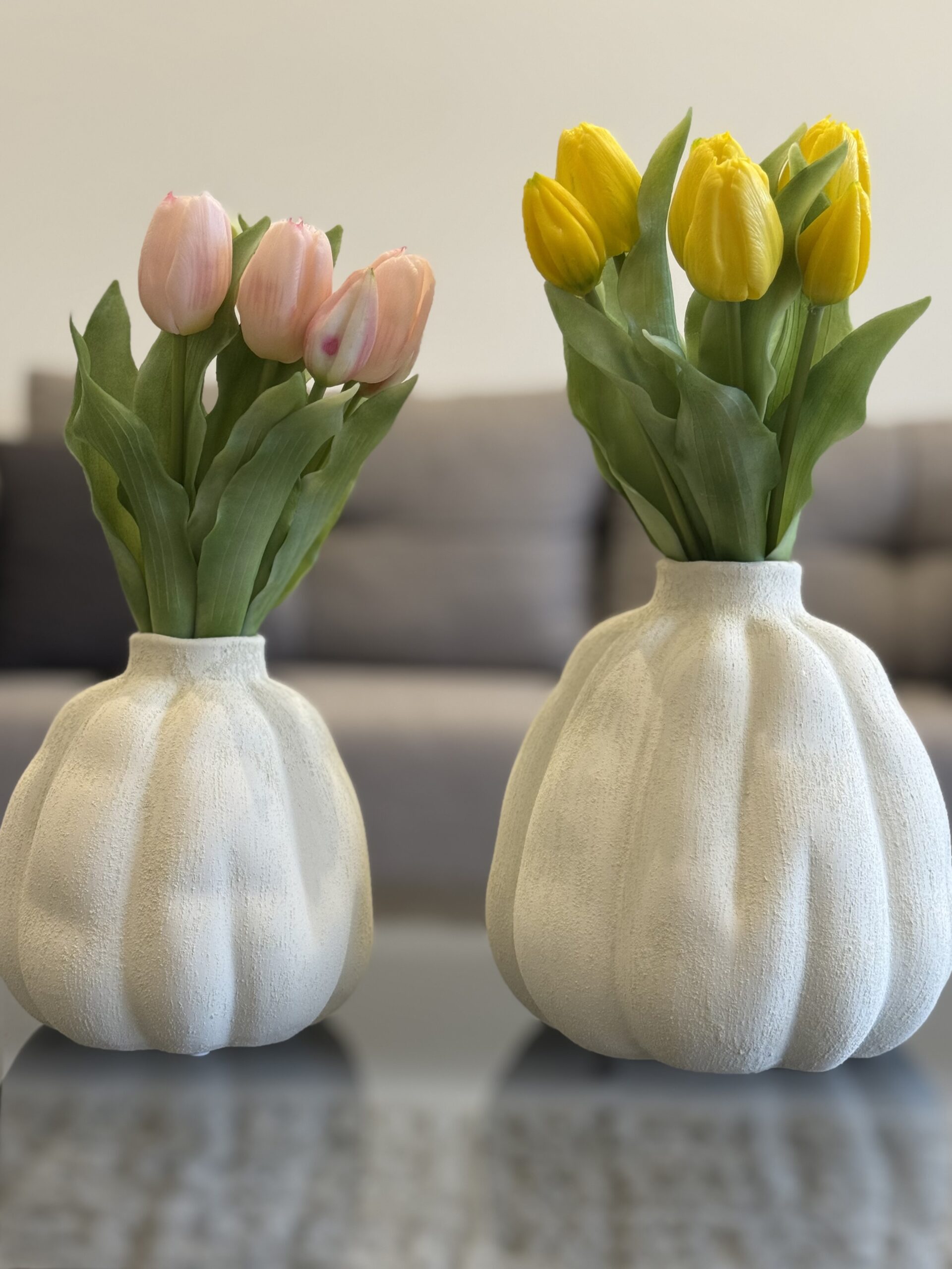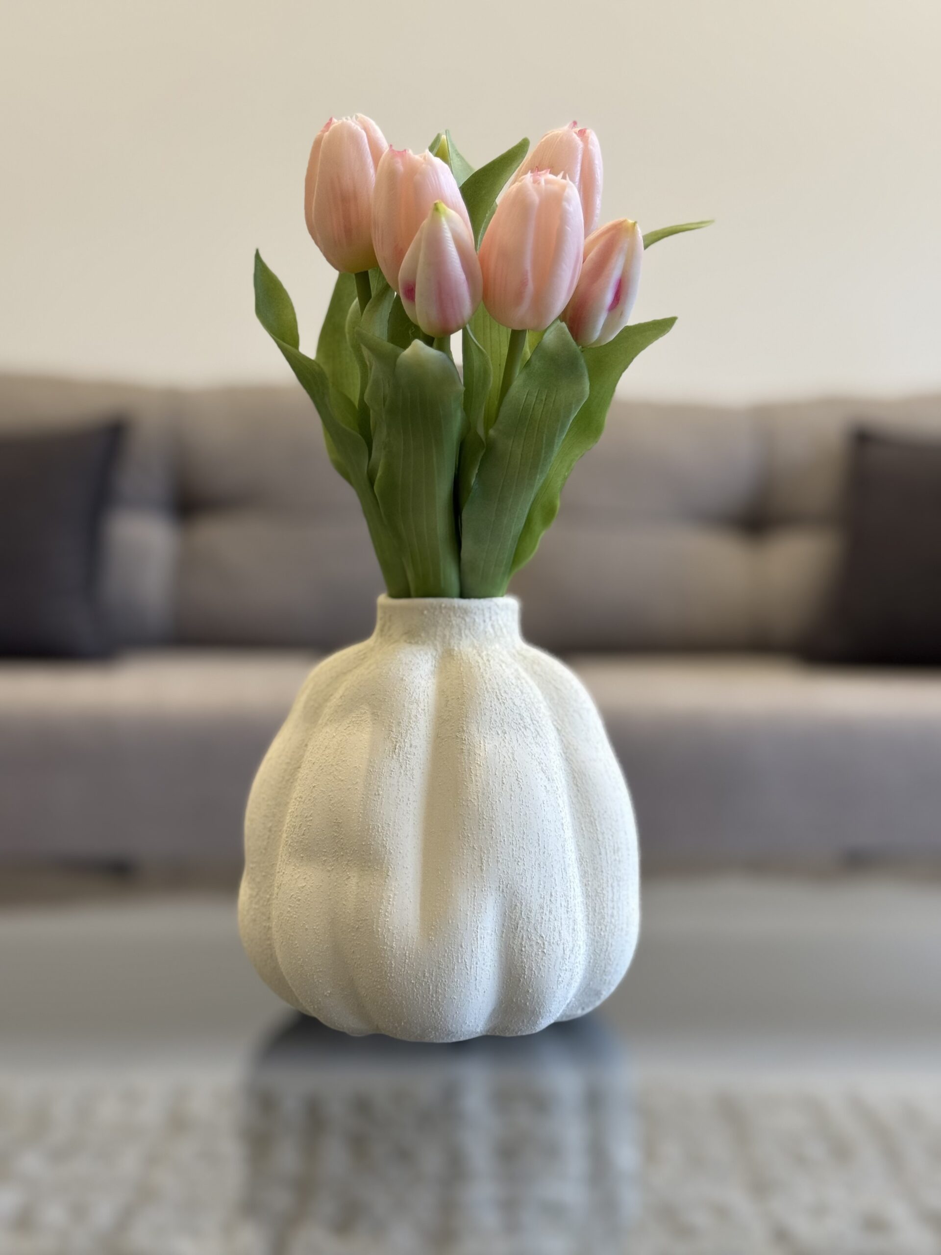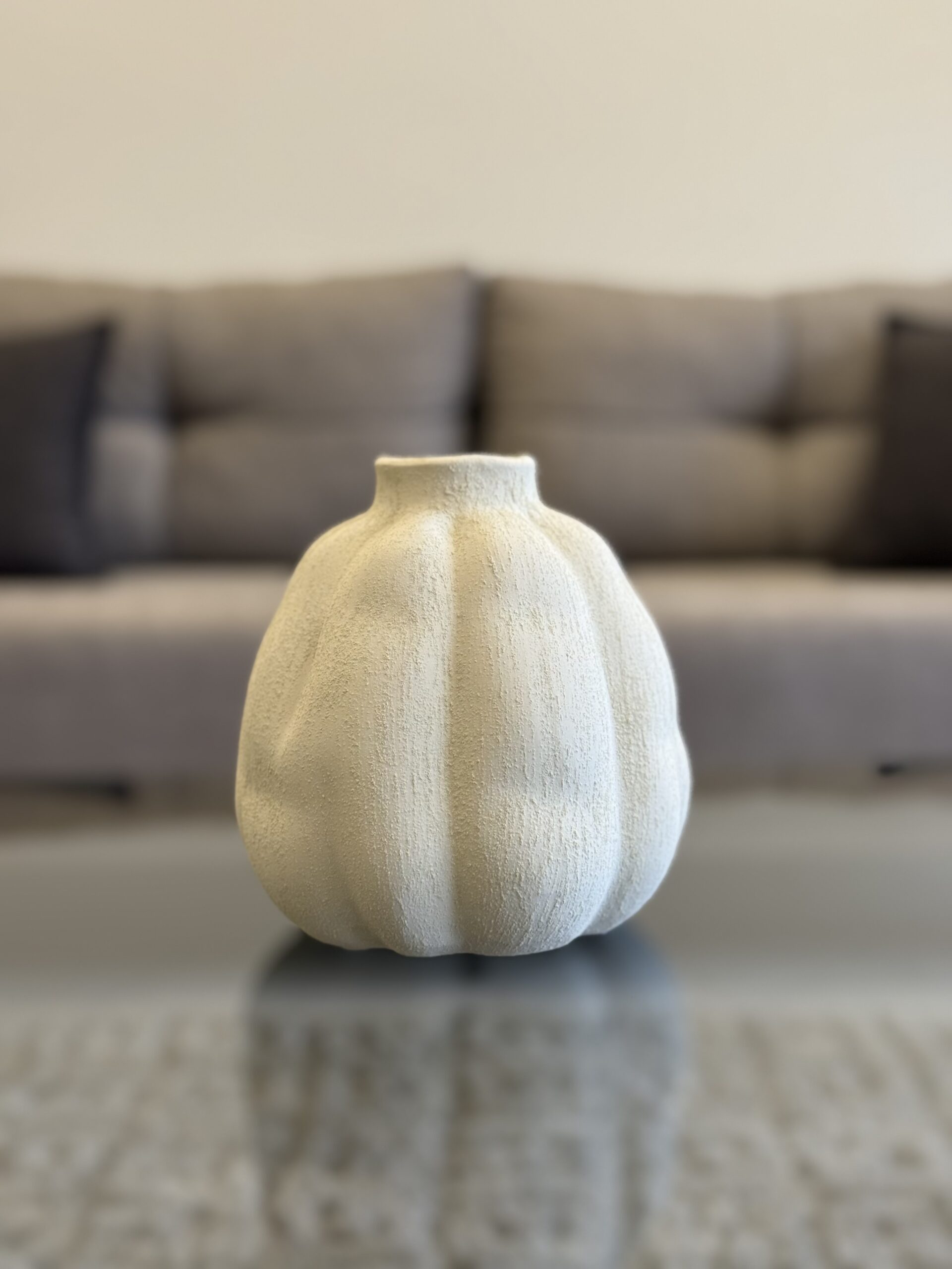 A softly sculpted ceramic vase with gentle ridges inspired by blooming petals. Its matte neutral finish adds warmth and elegance to any space.