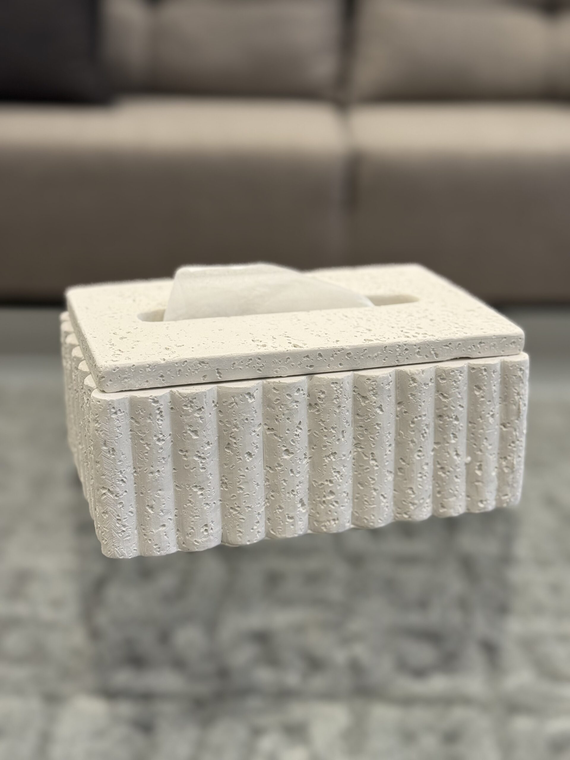 A modern tissue box cover with vertical ridged detailing and a softly textured stone-like finish. Designed to elevate everyday essentials with quiet elegance.