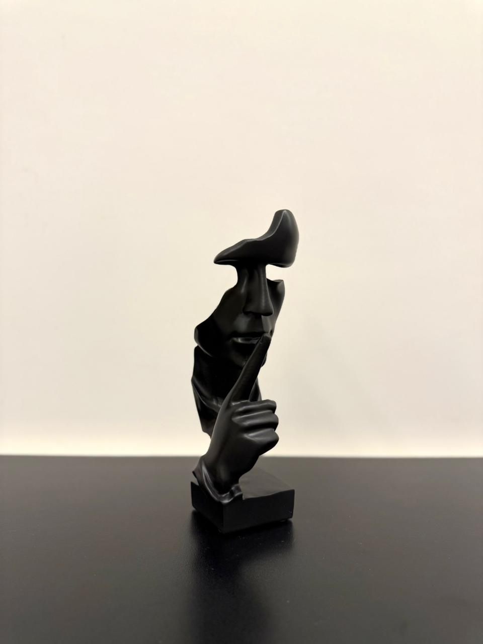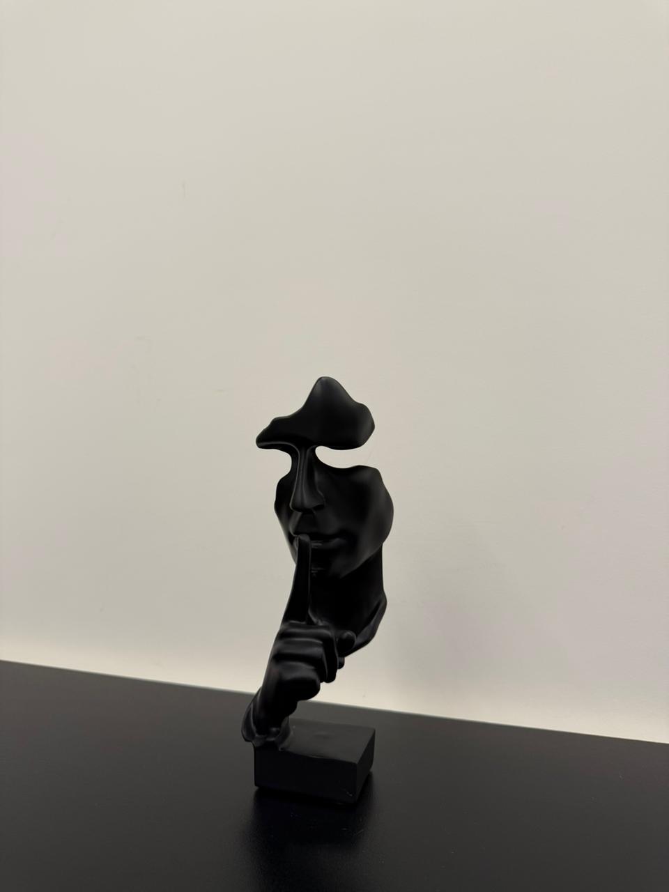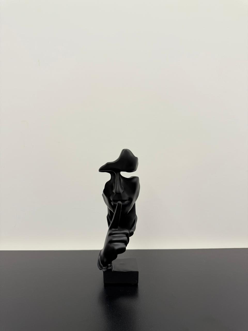 A modern resin sculpture featuring a partial face with missing eyes and a raised hand making a hush gesture. Mysterious and minimalist—perfect for contemporary decor.