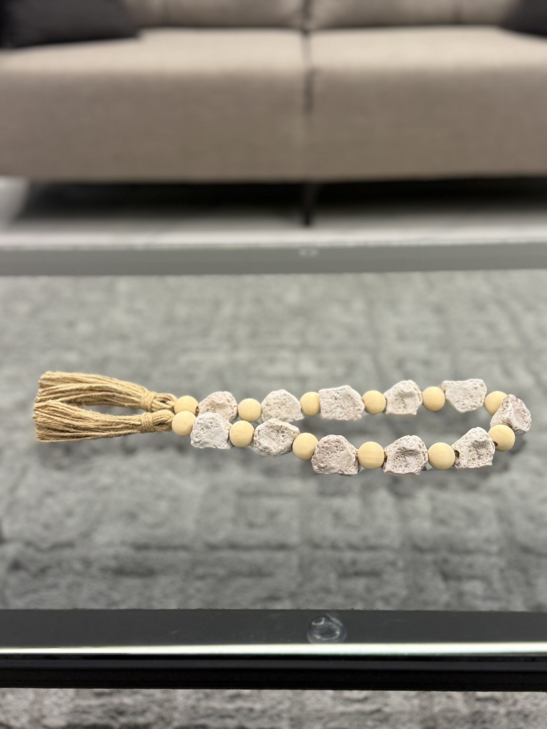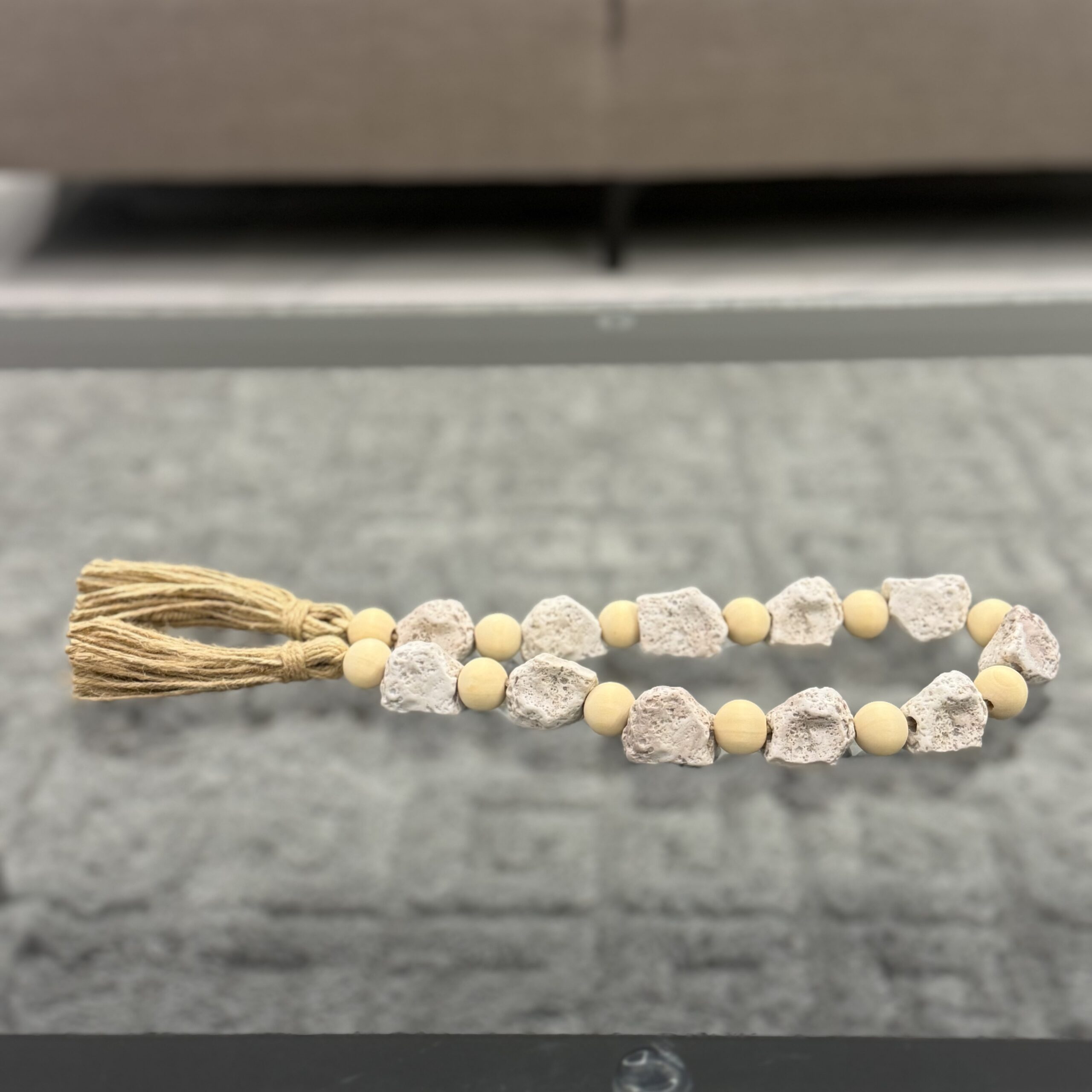 A handcrafted garland combining natural wooden beads and textured stone accents, finished with a rustic tassel. Ideal for adding an organic, earthy touch to your décor.