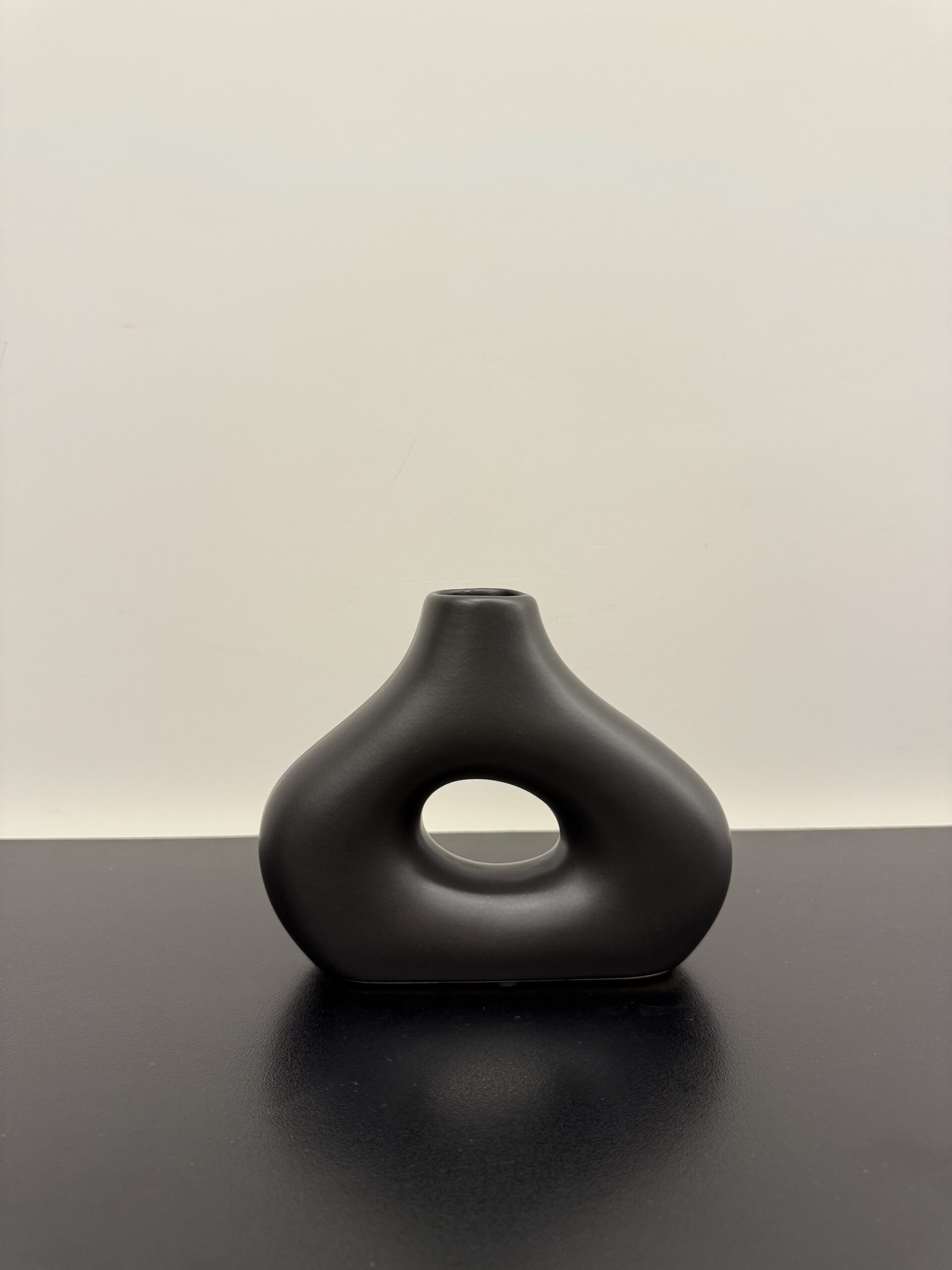 This unique vase draws inspiration from the classic donut shape, featuring a rounded form with edges artistically stretched to create an arch-like structure. Finished in matte black, it blends playful geometry with modern minimalism, making it a striking centerpiece or sculptural decor element.