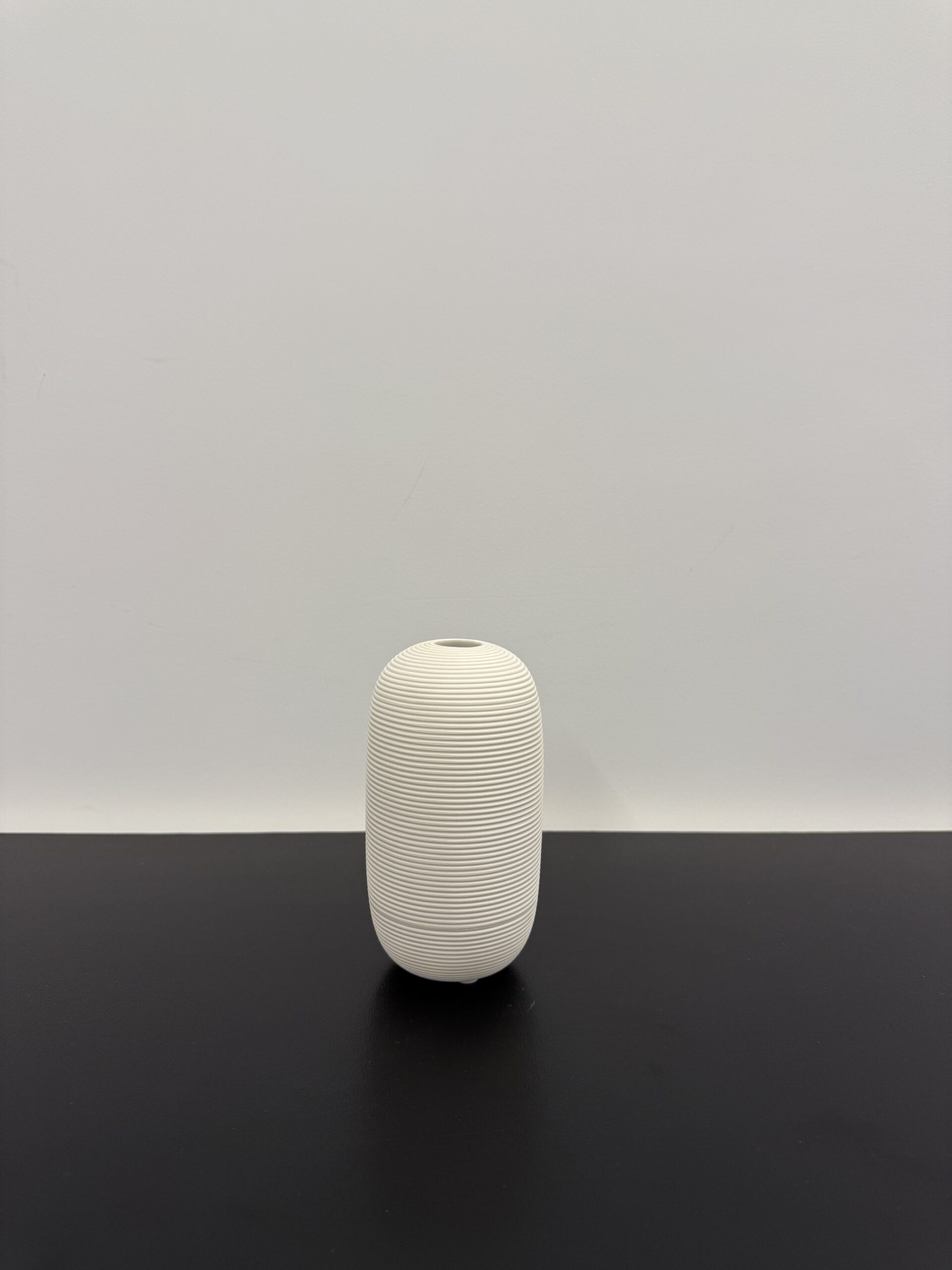A sleek and modern piece, this white ceramic vase features a classic cylindrical shape accented with subtle horizontal stripes. Its minimalist design adds texture and elegance, making it perfect for fresh or dried floral arrangements.