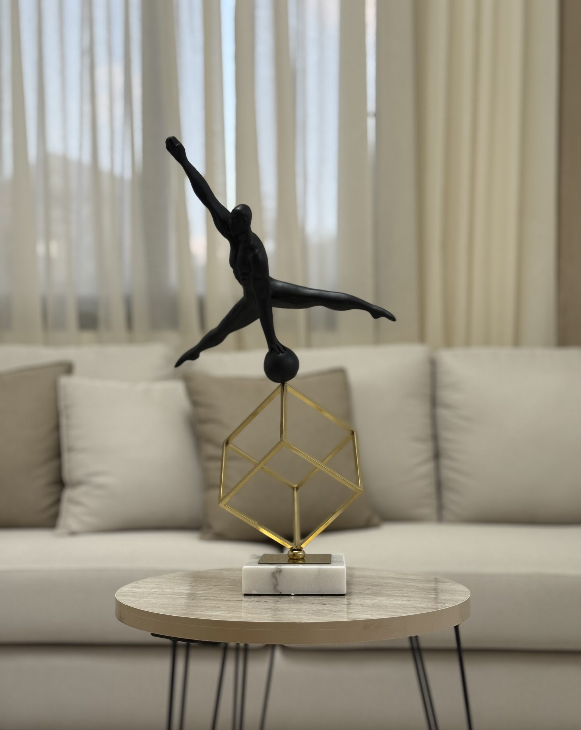 A modern resin figure balancing gracefully on a golden stainless-steel cube with a marble base. Symbol of strength and stability, perfect for elegant interiors.