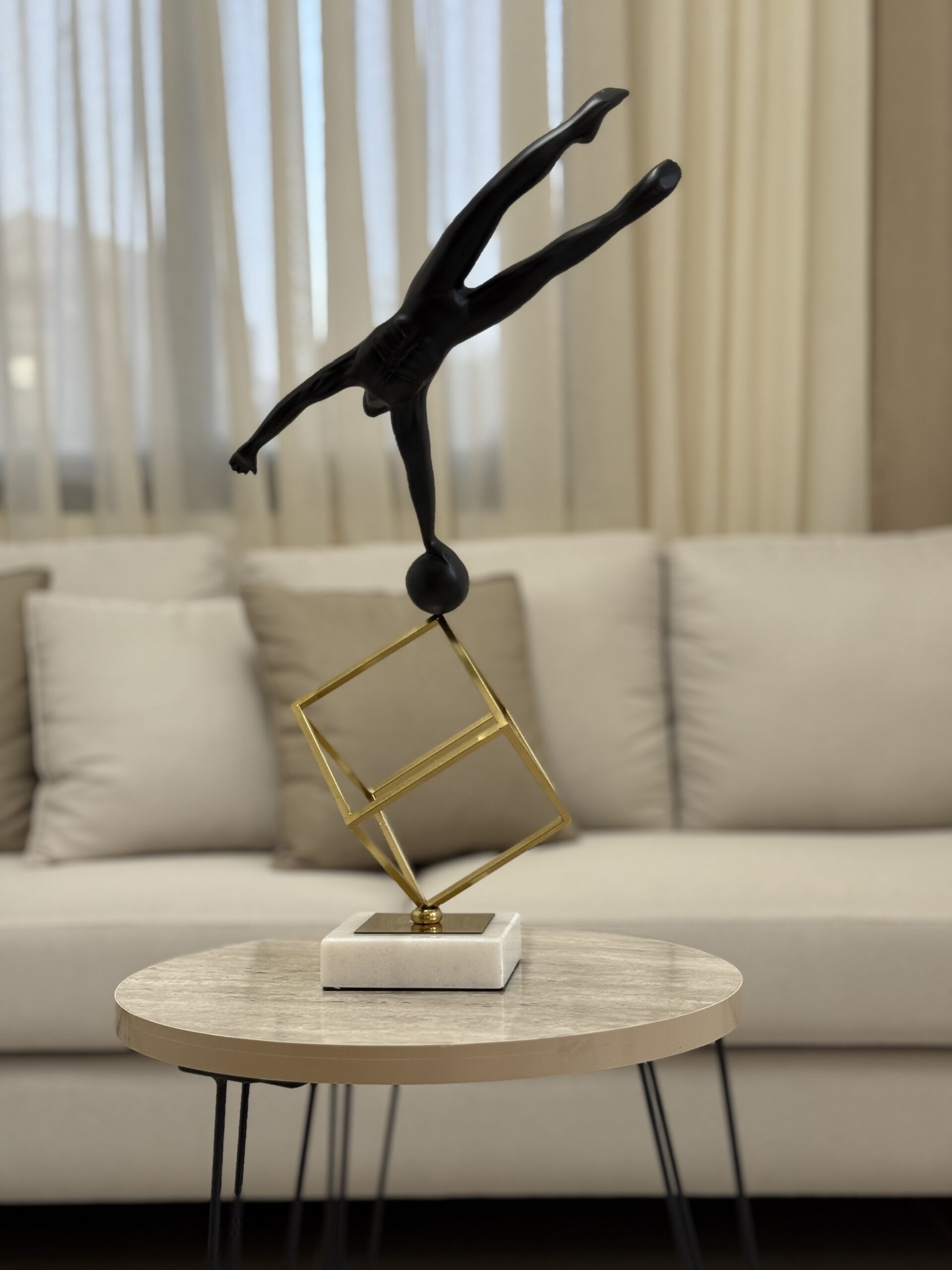 A sleek resin sculpture capturing the moment of a dive, balanced on a golden cube with a marble base. Adds movement and sophistication to any home decor.