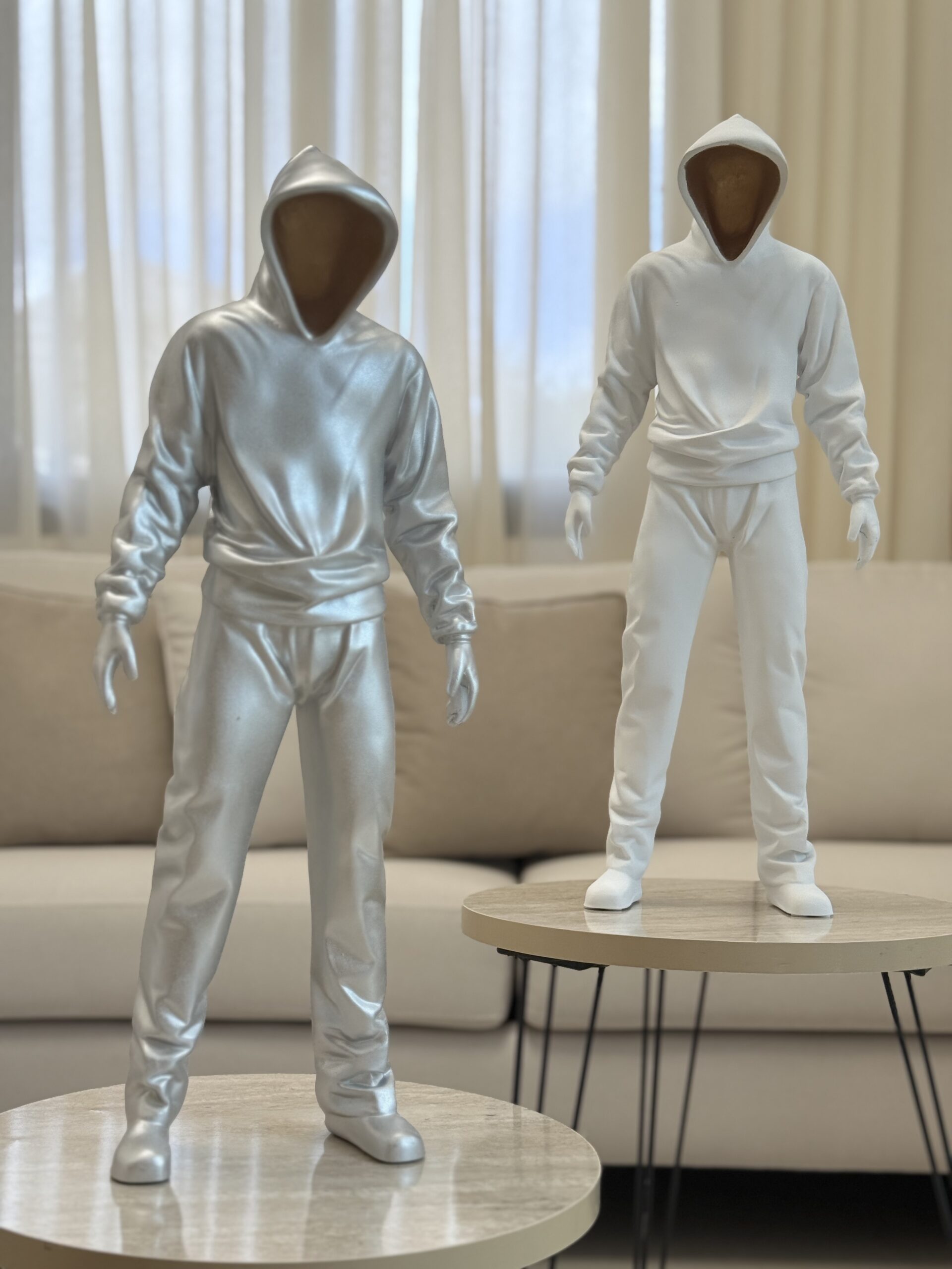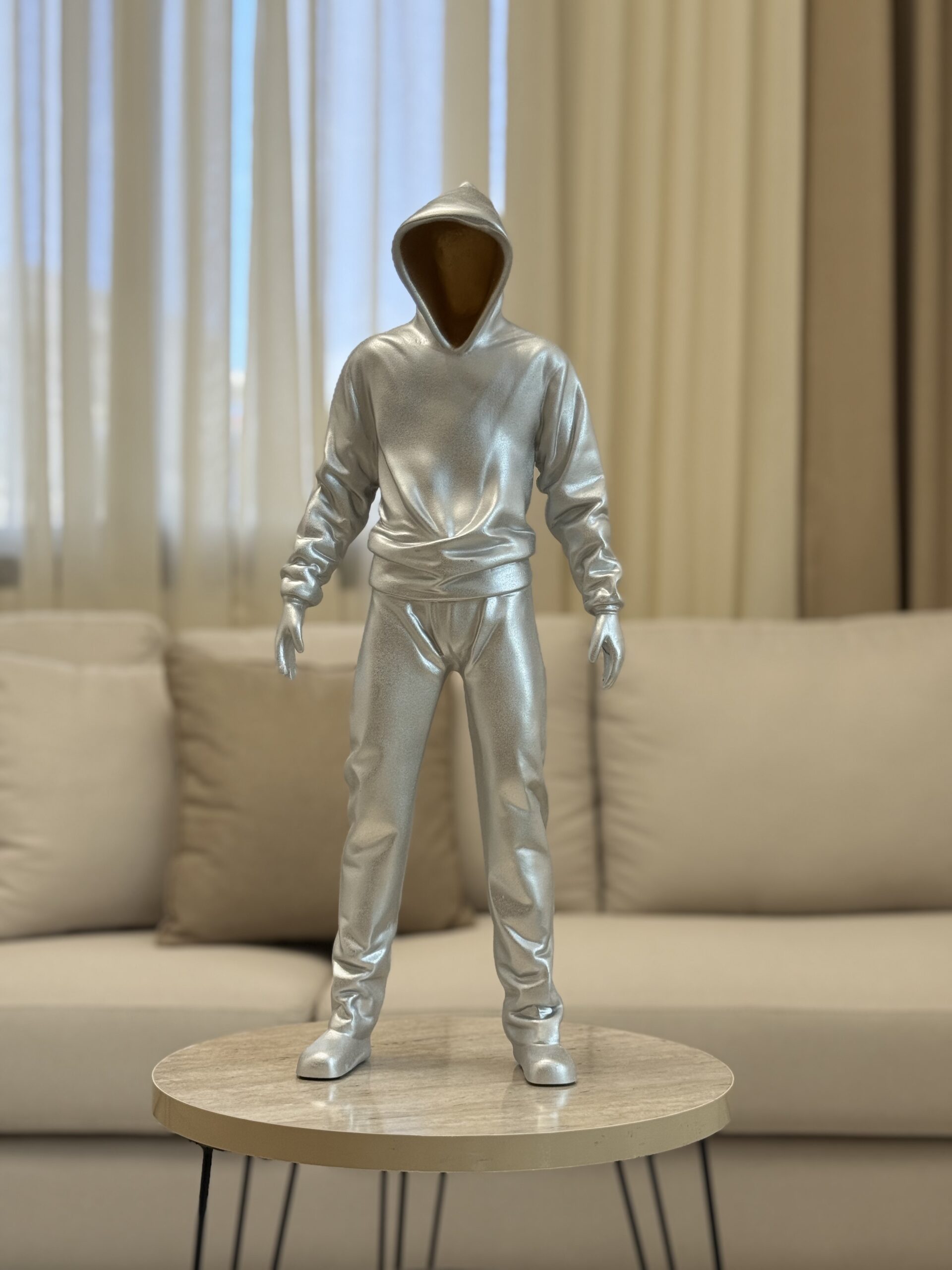 A modern resin sculpture featuring a faceless figure in silver and white hoodie and pants, symbolizing anonymity, mystery and urban style.