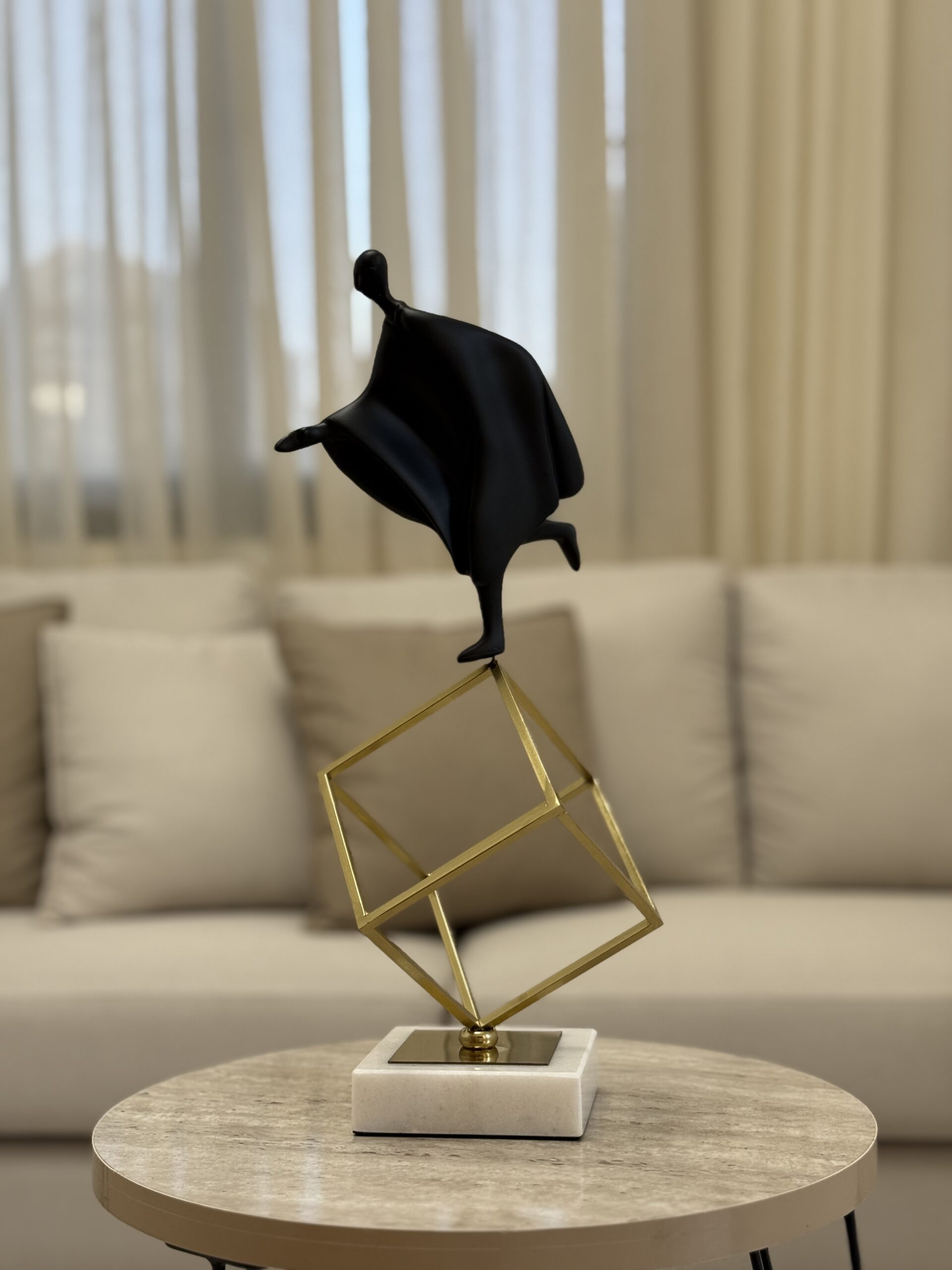A faceless resin figure in a flowing cape, standing boldly on a golden stainless-steel cube with a marble base. A statement of freedom, ambition, and modern art.