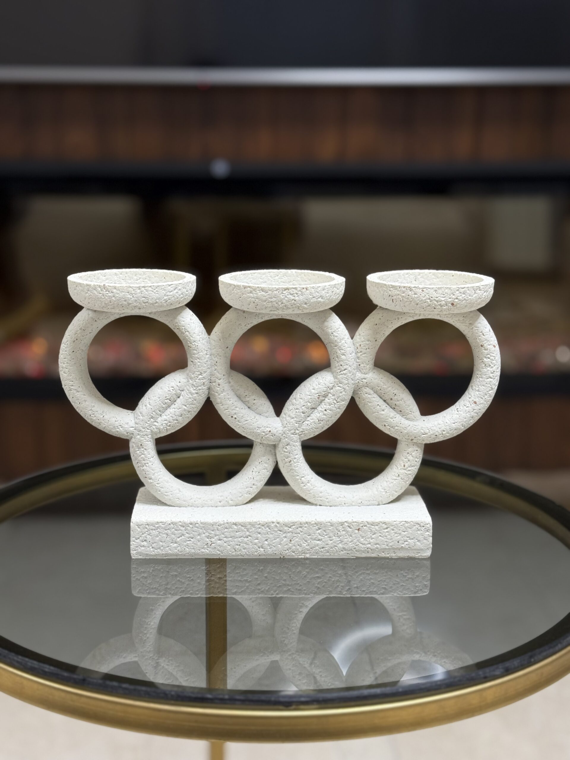 A sculptural candle holder featuring three interlinked loops on a solid base. Designed to create balance and visual interest, it adds a modern, minimalist touch to coffee tables, consoles, or dining settings.