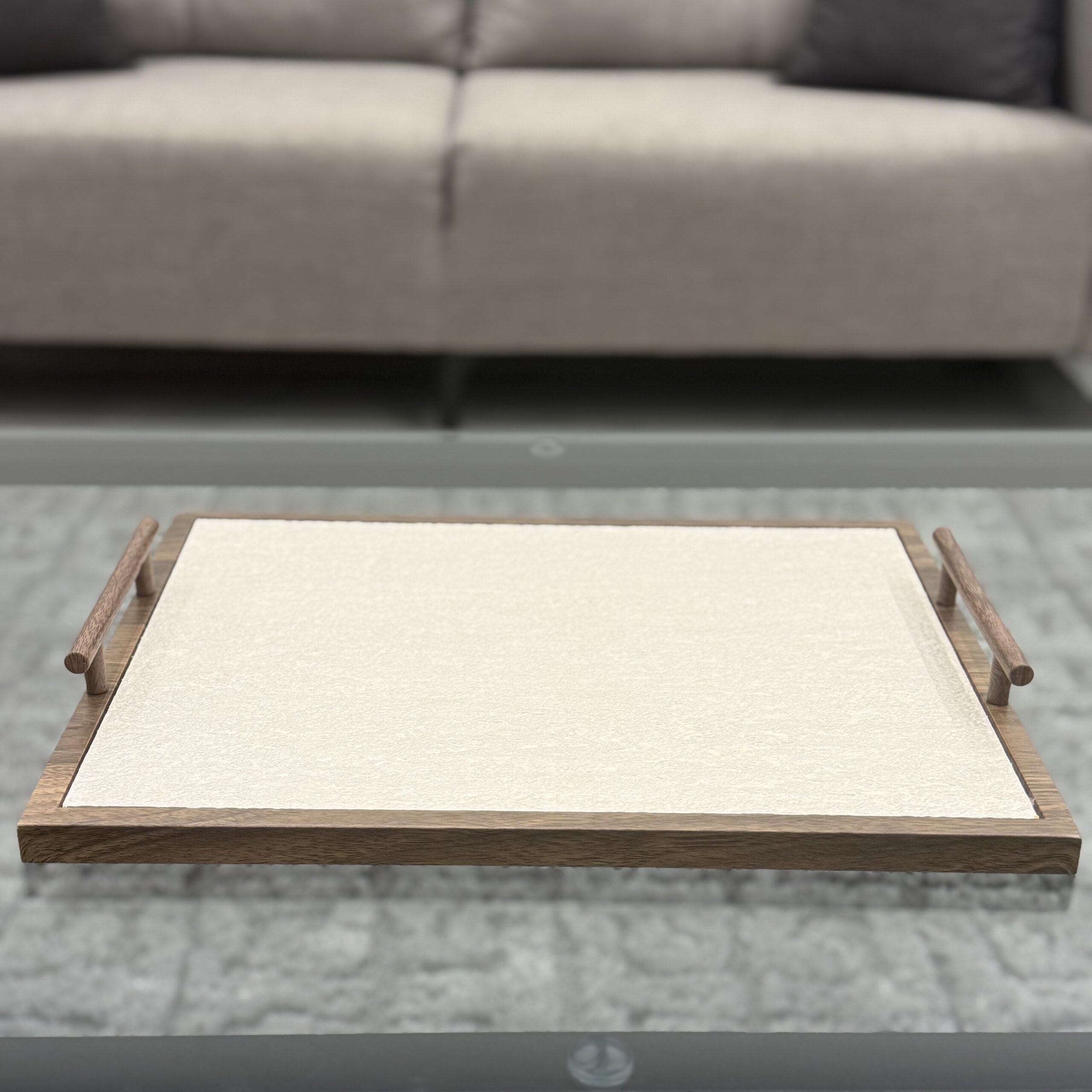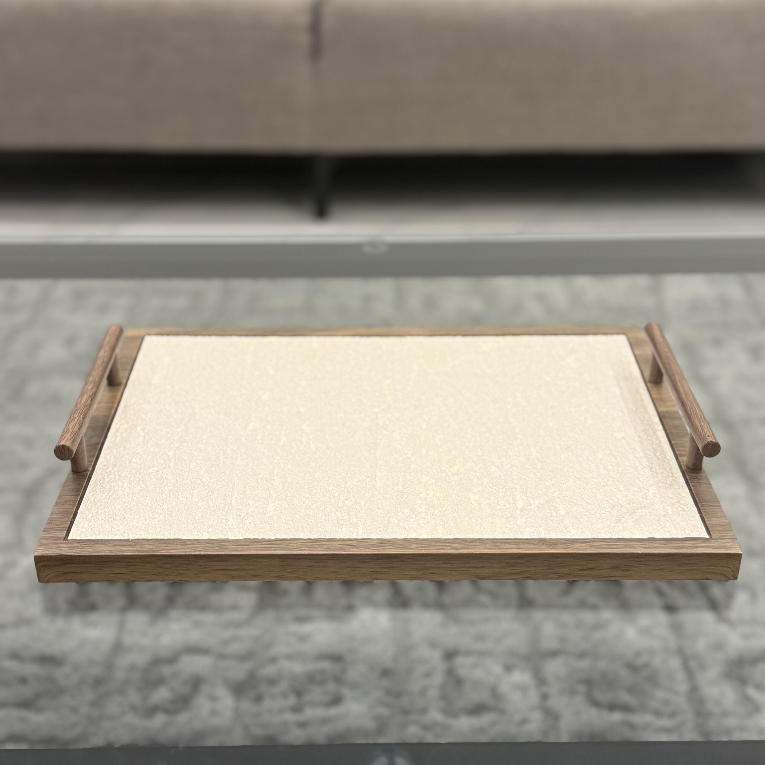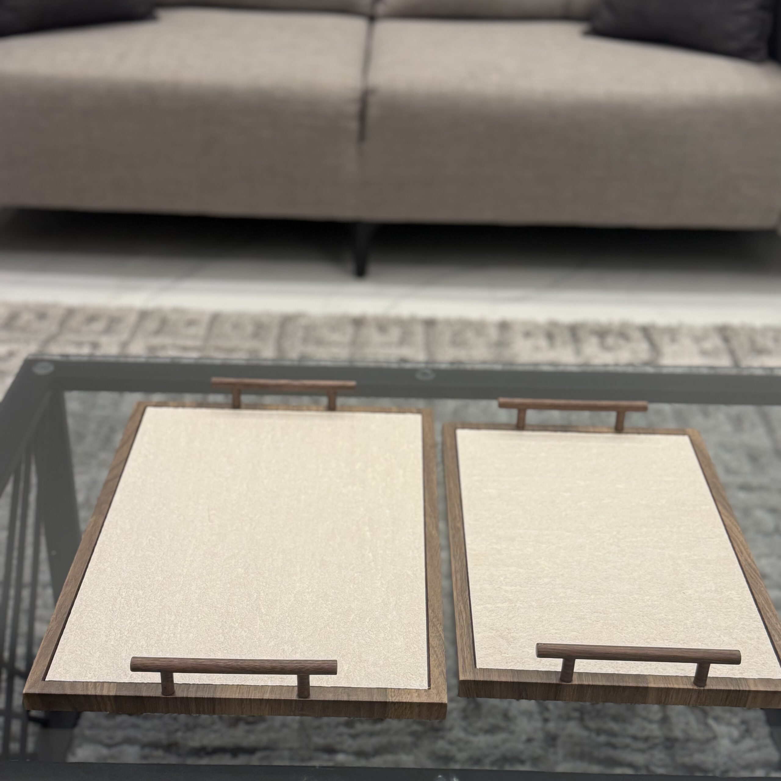 A refined rectangular tray set featuring a warm wooden frame and smooth minimalist surface, complete with sleek side handles for effortless serving and modern display.