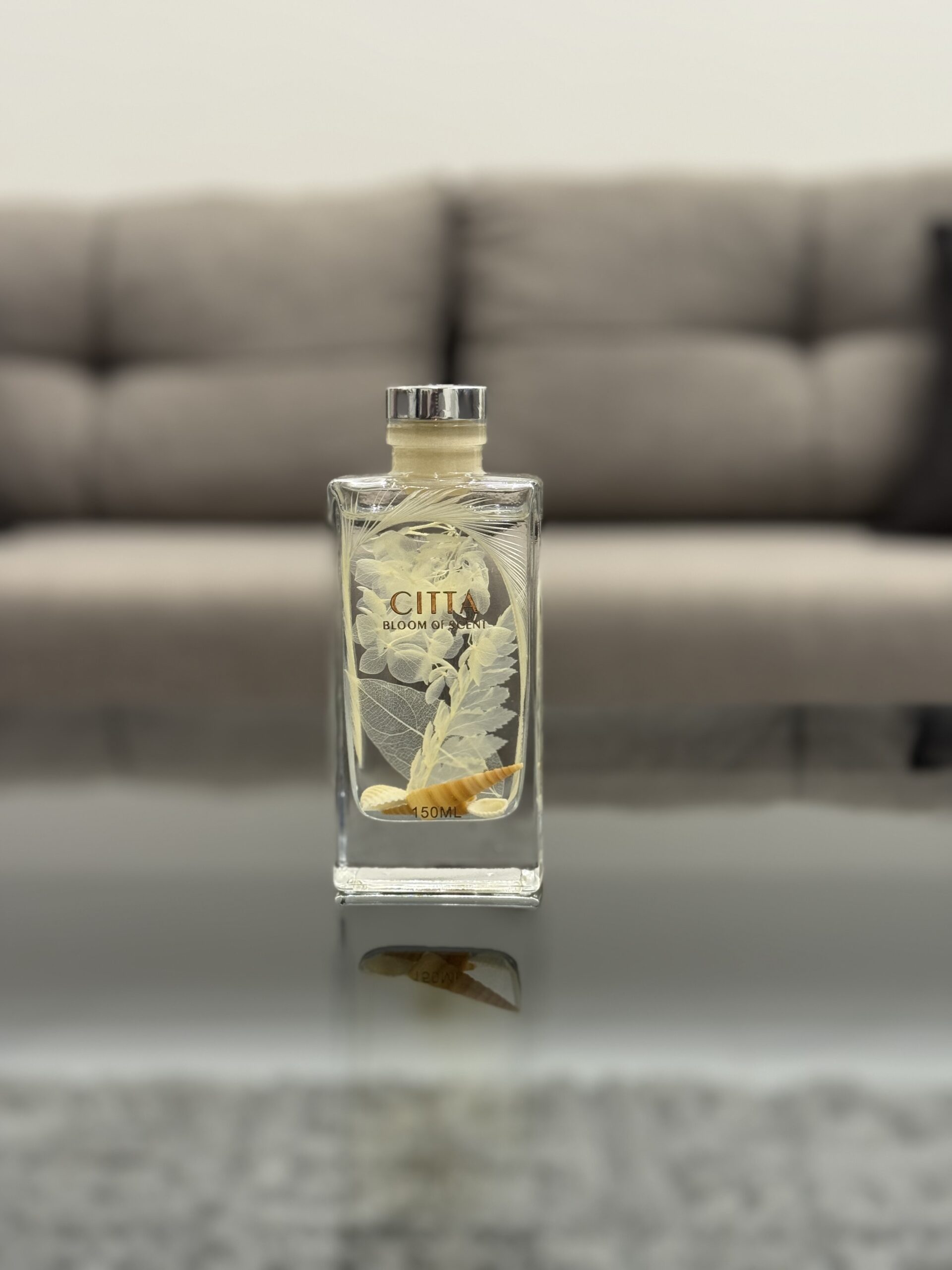 A beautiful diffuser with delicate white floral design and a unique long-lasting parfum that brings a fresh, calming scent to your space.